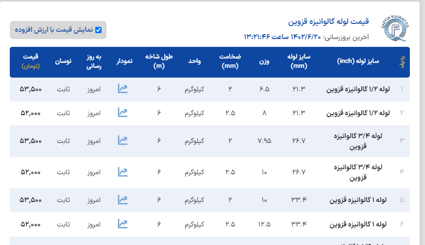لوله "1/2 ضخامت 2 میل ⬅️ 36000 تومان لوله "3/4 ضخامت 2 میل ⬅️ 36000 تومان لوله "1 ضخامت 2 میل ⬅️ 36000 تومان لوله "11/4 ضخامت 2 میل ⬅️ 36000 تومان لوله "11/2 ضخامت 2 میل ⬅️ 36000 تومان لوله " 2 ضخامت 2 میل ⬅️ 36000 تومان لوله 2/30 و 2/50 ض 3 میل ⬅️ 35000 تومان