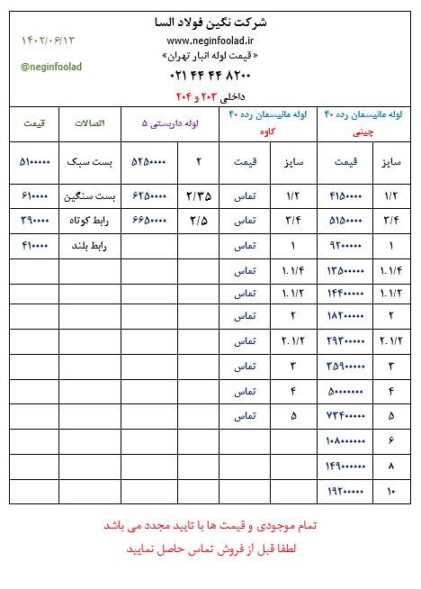 سایز1 اینچ رده20 برند وارداتی واحد شاخه سایز1/2 اینچ رده20 برندوارداتی واحدشاخه سایز3/4 اینچ رده20 برندوارداتی واحدشاخه سایز1/2 2 اینچ رده20 برندوارداتی واحدشاخه سایز2 اینچ رده20 برندوارداتی واحدشاخه سایز1/2 1 اینچ رده20 برندوارداتی واحدشاخه سایز3 اینچ رده20 برندوارداتی واحدشاخه سایز1/4 1 اینچ رده20 برندوارداتی واحدشاخه سایز4 اینچ رده20 برند وارداتی واحدشاخه سایز5 اینچ رده20 برندشوارداتی واحد شاخه سایز6 اینچ رده20 برندوارداتی واحدشاخه سایز8 اینچ رده20 برندوارداتی واحدشاخه جهت اطلاع از قیمت با شماره 03152467528 داخلی 100-103تماس بگیرید و یا از لینک تلگرام azinsepehralvand1@ ثبت سفارش کنید.