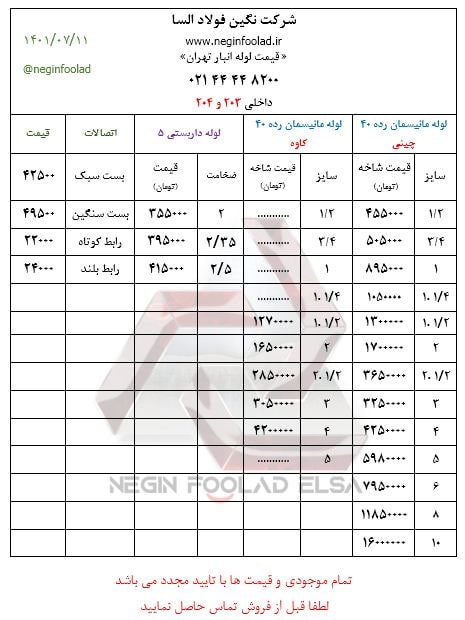 ⭕️لوله داربستی لوله ۲ داربستی ۳،۶۰۰،۰۰۰ لوله ۲/۳۵ داربستی ۳،۹۵۰،۰۰۰ لوله ۲/۵ داربستی ۴،۲۰۰،۰۰۰ بست سبک ۴۳۰،۰۰۰ بست سنگین ۵۰۰،۰۰۰ رابط کوتاه ۲۲۵،۰۰۰ رابط بلند ۲۴۰،۰۰۰