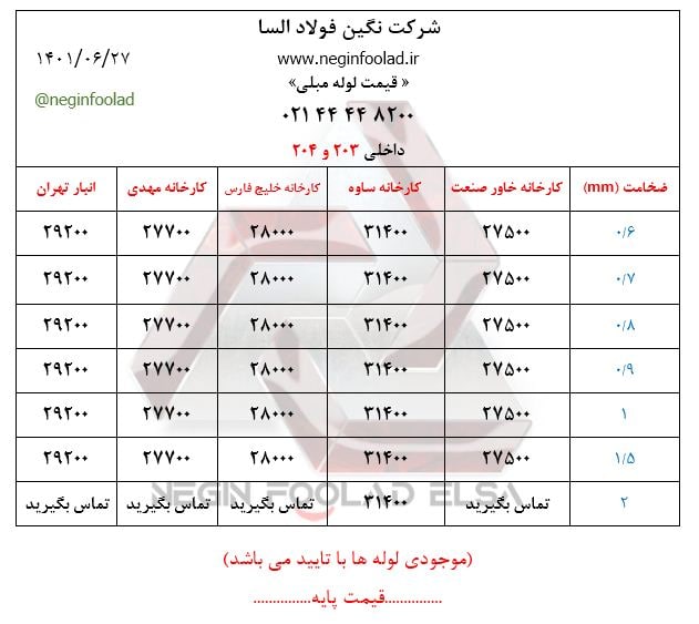 لیست #لوله_کالوپ لوله 6 اینچ ضخامت 6 ⬅️25600 تومان لوله 8 اینچ ضخامت 6 ⬅️25600 تومان لوله 10اینچ ضخامت 6⬅️25600 تومان لوله 12اینچ ضخامت 6⬅️25500 تومان لوله 12اینچ ضخامت 8⬅️25600 تومان لوله12اینچ ضخامت10⬅️25700 تومان لوله 14اینچ ضخامت 6⬅️25500 تومان لوله 14اینچ ضخامت 8⬅️25600 تومان لوله 14اینچ ضخامت 1⬅️25700 تومان لوله اسپیرال⬅️25600 تومان ⭕️ قيمت ها با احتساب ٩٪ماليات و فروش به صورت رسمي ميباشد ⭕️ #لیست_کچو لوله گاز روکار خانگی("۳/۴و "۱/۲) ضخامت ۲/۳۵⬅️۲۳۴۰۰ تومان لوله گاز روکار خانگی("۱/۴-۱ و" ۱) ضخامت ۲/۸⬅️۲۳۴۰۰ تومان لوله گاز روکار خانگی("۳/۴و "۱/۲) ضخامت ۲/۵⬅️۲۲۹۰۰ تومان لوله گاز روکار خانگی("۱تا "۴) ضخامت ۳تا۴⬅️۲۲۹۰۰ تومان لوله تست شده("۴تا" ۱/۲_۲) ضخامت ۳ تا ۳/۵⬅️۲۱۵۰۰ تومان لیست قیمت محصولات #گروه_صنعتی_سپاهان لوله گاز روکار: 1/2" تا "2 ضخامت 2/5 تا 3 ⬅️ 24460 تومان لوله مانیس گاز API: 1/2" تا "4 ضخامت 2.8 تا 4.4 ⬅️ 25530 تومان لوله تست: 1/2 و 3/4 ضخامت 2/3 ⬅️ 23450 تومان "1 تا "2 ضخامت 2/8 ⬅️ 23450 تومان 1/2 2 تا "8 ضخامت 2/5 تا 4 ⬅️ 22380 تومان 1/2 2 تا "8 ضخامت 5 تا 6 ⬅️ 22380 تومان لوله صنعتی : 1/2 تا "8 ضخامت 2/5 تا 4 ⬅️ 21150 تومان 1/2 2 تا "8 ضخامت 5 تا 6 ⬅️ 21150 تومان لوله آبرسانی: "4 تا "8 ضخامت 4.4 تا 4.8 ⬅️ 22380 تومان لوله حاصل از گاز: "1/2 تا "2 ضخامت 2/5 تا 3/6 ⬅️ 20940 تومان لوله حاصل از API : "4 تا "8 ضخامت 4.4 تا 4.8 ⬅️ 20940 تومان