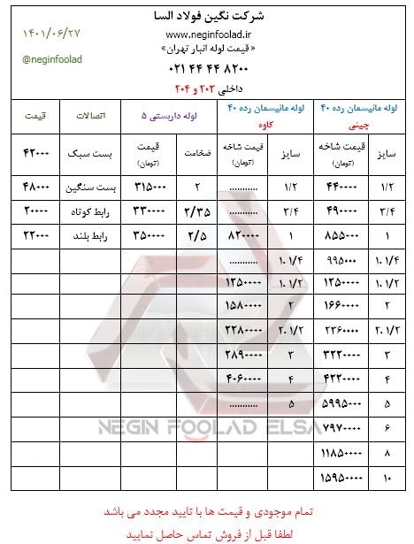 ⭐️ #لوله_مانیسمان_بدون_درز 📍 تحویل: #انبار_تهران 📅 تاریخ: 1401/06/23 ▫️رده ۲۰ (قیمت شاخه) - #چین🇨🇳 مانیسمان ۱/۲ اینچ ⬅️ ۳/۹۰۰/۰۰۰ مانیسمان ۳/۴ اینچ ⬅️ ۴/۳۰۰/۰۰۰ مانیسمان ۱ اینچ ⬅️ ۸/۱۰۰/۰۰۰ مانیسمان ۱/۴ ۱ اینچ ⬅️ ۹/۲۰۰/۰۰۰ مانیسمان ۱/۲ ۱ اینچ ⬅️۹/۳۰۰/۰۰۰ مانیسمان ۲ اینچ ⬅️۱۲/۶۰۰/۰۰۰ مانیسمان ۱/۲ ۲ اینچ ⬅️۱۹/۳۰۰/۰۰۰ مانیسمان ۳ اینچ ⬅️ ۲۱/۶۰۰/۰۰۰ مانیسمان ۴ اینچ ⬅️۳۶/۷۰۰/۰۰۰ مانیسمان ۵ اینچ ⬅️۴۶/۳۰۰/۰۰۰ مانیسمان ۶ اینچ ⬅️۶۱/۰۰۰/۰۰۰ مانیسمان ۸ اینچ ⬅️۹۵/۰۰۰/۰۰۰ مانیسمان ۱۰ اینچ ⬅️ ۱۳۰/۰۰۰/۰۰۰ مانیسمان ۱۲ اینچ ⬅️Call ▫️رده ۴۰(قیمت شاخه) - #چین🇨🇳 مانیسمان ۱/۲ اینچ ⬅️ ۴/۳۰۰/۰۰۰ مانیسمان ۳/۴ اینچ ⬅️ ۴/۸۰۰/۰۰۰ مانیسمان ۱ اینچ ⬅️ ۸/۴۰۰/۰۰۰ مانیسمان ۱/۴ ۱ اینچ ⬅️ ۱۰/۳۰۰/۰۰۰ مانیسمان ۱/۲ ۱ اینچ ⬅️ ۱۲/۶۰۰/۰۰۰ مانیسمان ۲ اینچ ⬅️ ۱۶/۸۰۰/۰۰۰ مانیسمان ۱/۲ ۲ اینچ ⬅️ ۲۳/۹۰۰/۰۰۰ مانیسمان ۳ اینچ ⬅️۳۲/۱۰۰/۰۰۰ مانیسمان ۴ اینچ ⬅️ ۴۲/۳۰۰/۰۰۰ مانیسمان ۵ اینج ⬅️۵۹/۹۰۰/۰۰۰ مانیسمان ۶ اینچ ⬅️۷۹/۸۰۰/۰۰۰ مانیسمان ۸ اینچ ⬅️۱۱۹/۰۰۰/۰۰۰ مانیسمان ۱۰ اینچ ⬅️۱۶۰/۰۰۰/۰۰۰ ▫️رده ۴۰ (قیمت شاخه) - #کاوه مانیسمان ۱ اینچ ⬅️ ۸/۳۰۰/۰۰۰ مانیسمان ۱/۴ ۱ اینچ ⬅️ call مانیسمان ۱/۲ ۱ اینچ ⬅️۱۲/۵۰۰/۰۰۰ مانیسمان ۲ اینچ ⬅️ ۱۵/۷۰۰/۰۰۰ مانیسمان ۱/۲ ۲ اینچ ⬅️۲۲/۸۰۰/۰۰۰ مانیسمان ۳ اینچ ⬅️۲۸/۸۰۰/۰۰۰ مانیسمان ۴ اینچ ⬅️ ۴۰/۵۰۰/۰۰۰ مانیسمان ۵ اینچ ⬅️ call ▫️رده ۸۰ (قیمت شاخه) - #چین🇨🇳 مانیسمان ۱/۲ اینچ ⬅️ ۶/۳۰۰/۰۰۰ مانیسمان ۳/۴ اینچ ⬅️۷/۲۰۰/۰۰۰ مانیسمان ۱ اینچ ⬅️ ۹/۹۰۰/۰۰۰۰ مانیسمان ۱/۴ ۱ اینچ ⬅️۱۴/۷۰۰/۰۰۰ مانیسمان ۱/۲ ۱ اینچ ⬅️ ۱۷/۰۰۰/۰۰۰ مانیسمان ۲ اینچ ⬅️ ۲۴/۲۰۰/۰۰۰ مانیسمان ۱/۲ ۲ اینچ ⬅️ ۳۰/۸۰۰/۰۰۰ مانیسمان ۳ اینچ ⬅️۴۳/۳۰۰/۰۰۰ مانیسمان ۴ اینچ ⬅️ ۶۴/۳۰۰/۰۰۰ مانیسمان ۵ اینچ ⬅️۹۱/۰۰۰/۰۰۰ مانیسمان ۶ اینچ ⬅️ ۱۲۵/۰۰۰/۰۰۰ مانیسمان ۸ اینچ ⬅️ ۱۹/۰۰۰/۰۰۰ مانیسمان ۱۰ اینچ ⬅️ call مانیسمان ۱۲ اینچ ⬅️ call ✅فاکتور رسمی