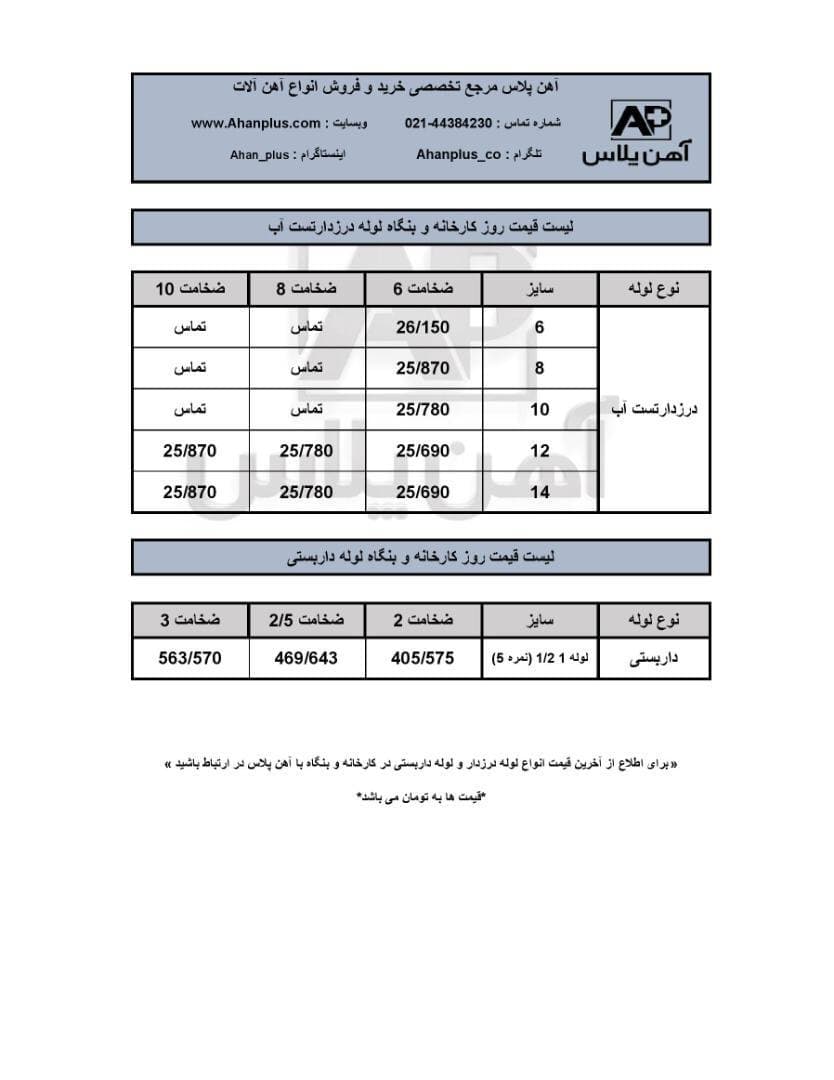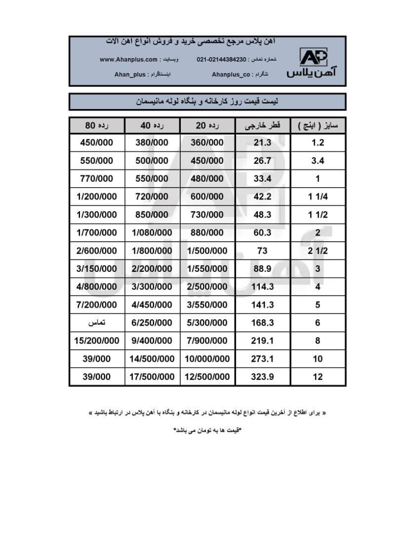 شنبه 6 شهریور ماه 1400 👈 لوله مانیسمان چینی رده 40 (قیمت شاخه) - کارخانه اصفهان 1 اینچ ⬅️ 560.000 تومان ½.1 اینچ ⬅️ 770.000 تومان 2 اینچ ⬅️ 1.048.000 تومان 3 اینچ ⬅️ 2.170.000 تومان 4 اینچ ⬅️ 3.200.000 تومان 👈 لوله مانیسمان چینی رده 40 (قیمت شاخه) - کارخانه ساوه 2 اینچ ⬅️ 1.048.000 تومان 4 اینچ ⬅️ 3.200.000 تومان 8 اینچ ⬅️ 8.700.000 تومان