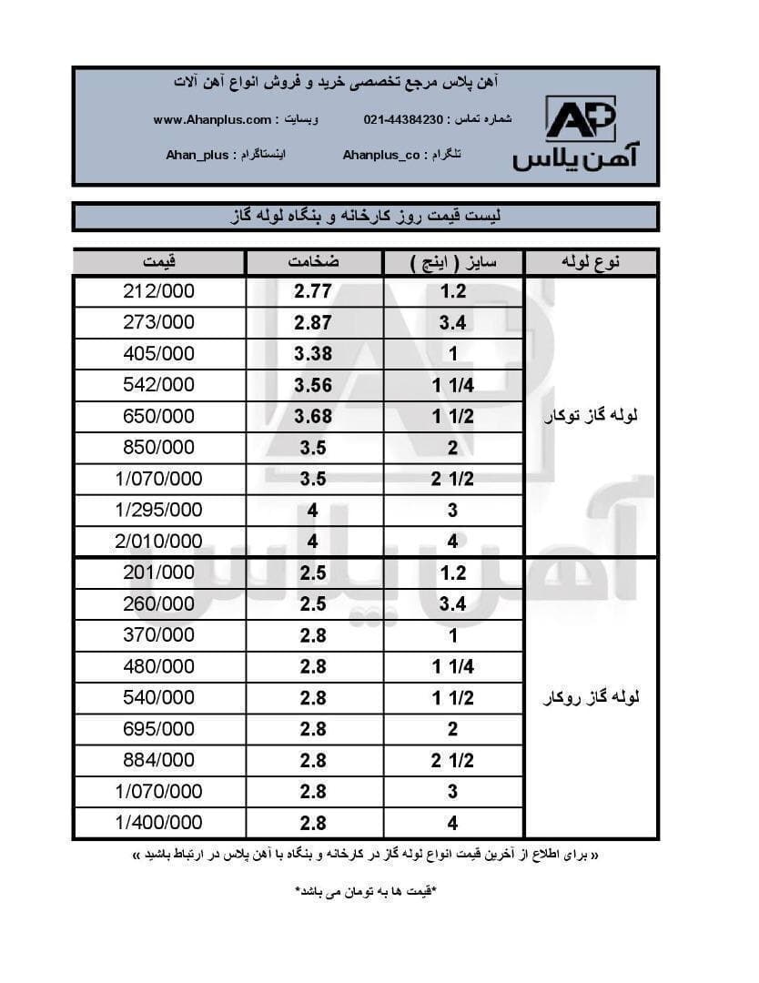🌸1400/06/08🌸 #قیمت_لوله_گاز 📱 @ahanplus_co 📎اطلاع از قیمت روز کارخانجات 🔻 💻 www.ahanplus.com ✔️ جهت تایید قیمت و موجودی با آهن پلاس در ارتباط باشید✔️ 📞 02144384230 📞 02144376579