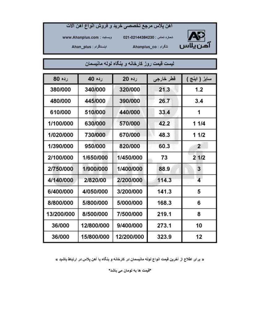 یک شنبه 24 مرداد ماه 1400 👈 لوله مانیسمان چینی رده 40 (قیمت شاخه) - کارخانه اصفهان 1 اینچ ⬅️ 500.000 تومان ½.1 اینچ ⬅️ 730.000 تومان 2 اینچ ⬅️ 940.000 تومان 3 اینچ ⬅️ 1.990.000 تومان 4 اینچ ⬅️ 3.015.000 تومان 👈 لوله مانیسمان چینی رده 40 (قیمت شاخه) - کارخانه ساوه 2 اینچ ⬅️ 940.000 تومان 4 اینچ ⬅️ 3.015.000 تومان 8 اینچ ⬅️ 8.200.000 تومان