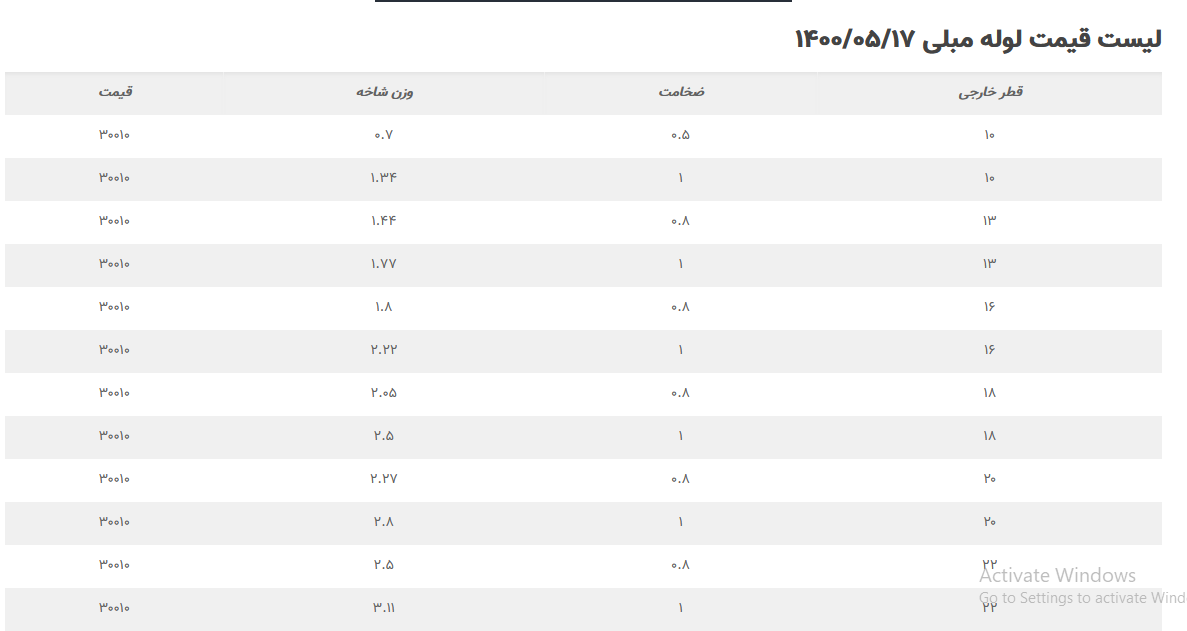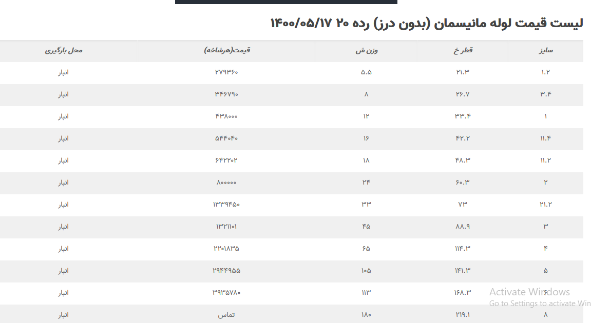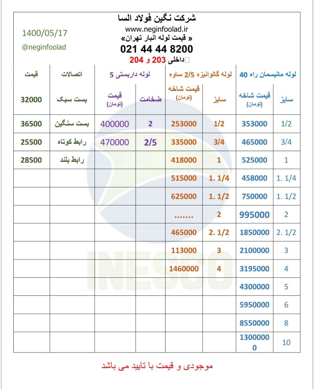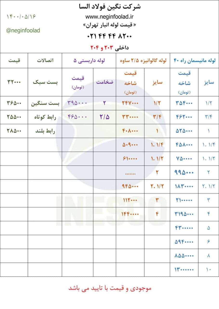 یکشنبه 17 مرداد ماه 1400 👈 لوله مانیسمان چینی رده 40 (قیمت شاخه) - کارخانه اصفهان 1 اینچ ⬅️ 500.000 تومان ½.1 اینچ ⬅️ 730.000 تومان 2 اینچ ⬅️ 940.000 تومان 3 اینچ ⬅️ 1.990.000 تومان 4 اینچ ⬅️ 3.015.000 تومان 👈 لوله مانیسمان چینی رده 40 (قیمت شاخه) - کارخانه ساوه 2 اینچ ⬅️ 940.000 تومان 4 اینچ ⬅️ 3.015.000 تومان 8 اینچ ⬅️ 8.200.000 تومان ✅جهت خرید،مشاوره و ارتباط با کارشناسان فروش: ☎️ + 021-82955560-82955529-82955555