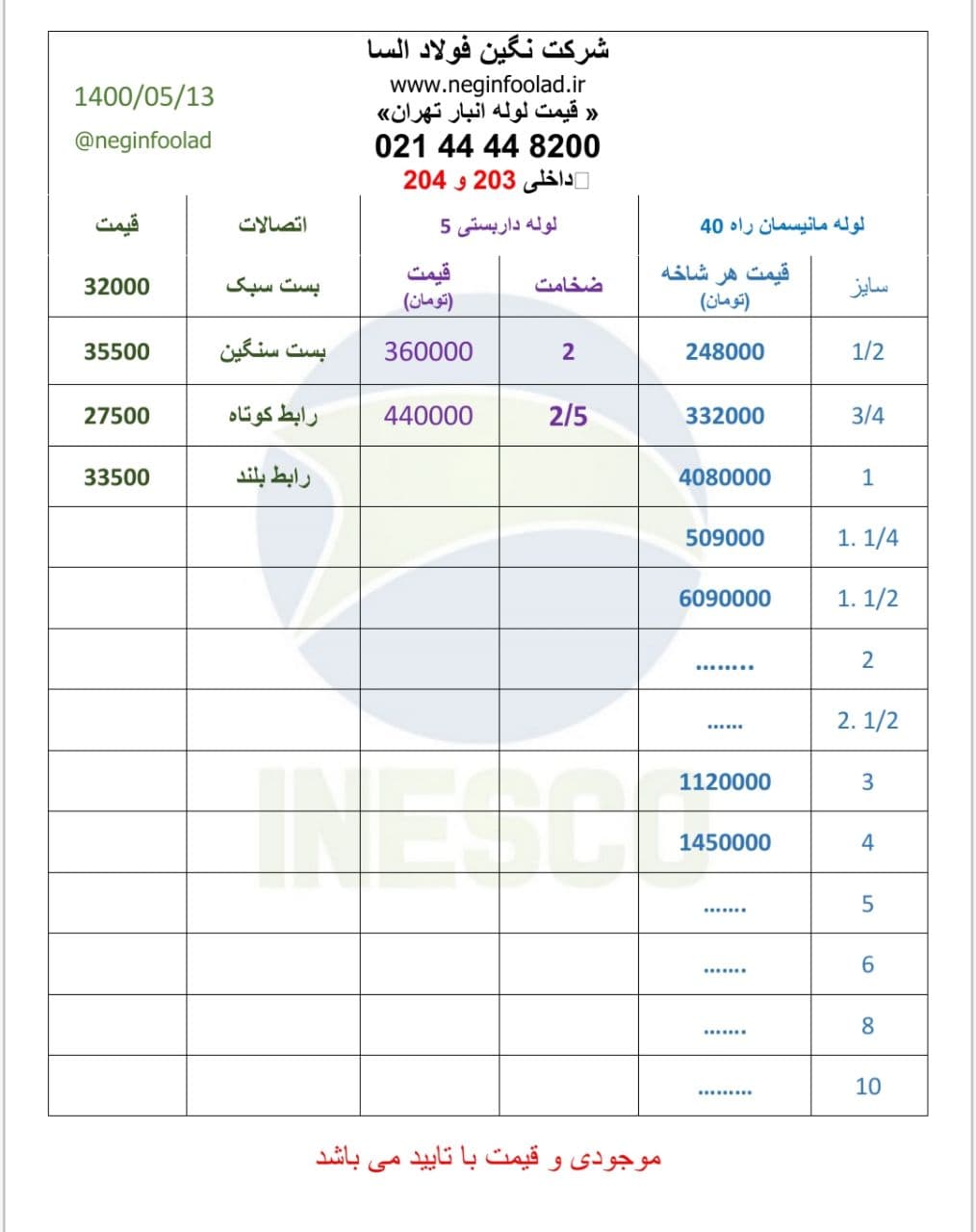 🌼1400/05/13🌼 #قیمت_لوله_مانيسمان 📱@ahanplus_co ✔️جهت تایید قیمت و موجودی با آهن پلاس در ارتباط باشید✔️ 📞 02144384230 📞 02144376579