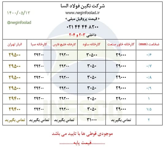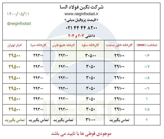 #لوله_پروفیل_مبلی #صبا_پروفیل #انبار_کارخانه 🔴قیمت پایه ضخامت۰/۵میلیمتر________call ضخامت۰/۶میلیمتر______۲۹۳۰۰۰ ضخامت۰/۷میلیمتر______۲۹۳۰۰۰ ضخامت۰/۸میلیمتر______۲۹۳۰۰۰ ضخامت۰/۹میلیمتر______۲۹۳۰۰۰ ضخامت۱میلیمتر________۲۹۳۰۰۰ ضخامت۱/۵میلیمتر______۲۹۳۰۰۰ ✅تمامی قیمتها با تایید میباشد 📞۱۸۳۶ 📞۰۲۱-۶۶۹۱۱۰۰۷ 📍داخلی(۴۲۰)