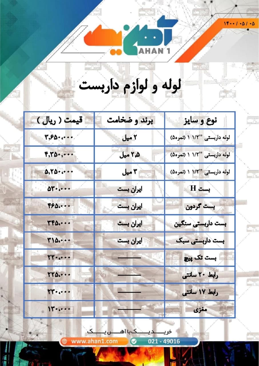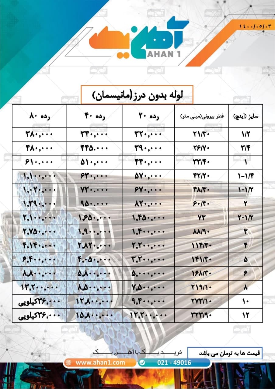 [Forwarded from آهن یک_لوله های فولادی] [ Photo ] 🗓1400/05/04 #لوله_مانیسمان_رده_20_40_80 A 106 , A 53 , APi 5L , Gr B به دلیل نوسان و برای تایید موجودی و قیمت تماس بگیرید. تلفن: 49016_021 داخلی:211-210 داخلی:218-213 🔘https://t.me/ahan_1_loole 🔘https://t.me/ahan1co 🔘https://ahan1.com ✅خرید یک با آهن یک👈آهن یک (https://ahan1.com/)برای اطلاع از قیمت ها به سایت آهن یک مراجعه فرمایید.👈آهن یک