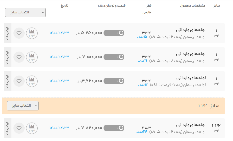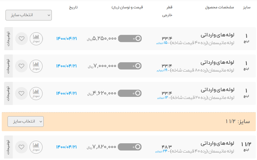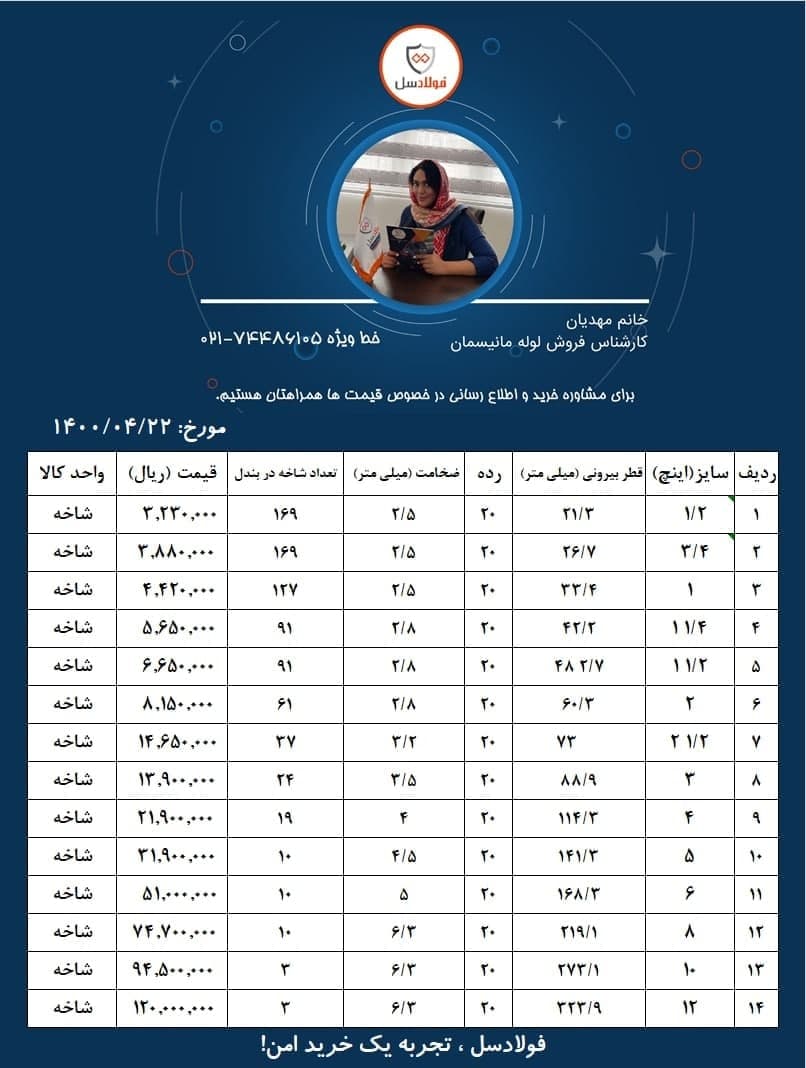 #لوله_مانیسمان وارداتی 🗓 دوشنبه 21 تیر ماه 1400 🗓 💠 رده 40 (قیمت شاخه)💠 1/2 اینچ با قطر خارجی 21/3 : 338,000 3/4 اینچ با قطر خارجی 26/7 : 447.000 1 اینچ با قطر خارجی 33/4 : 525.000 11/2 اینچ با قطر خارجی 48/3 : 782.000 2 اینچ با قطر خارجی 60/3 : 993,000 21/2 اینچ با قطر خارجی 73 : 1.706.000 4 اینچ با قطر خارجی 114/3 : 3.140.000 📌ارتباط با کارشناسان فروش :👇🏻 ☎️ 021-54103