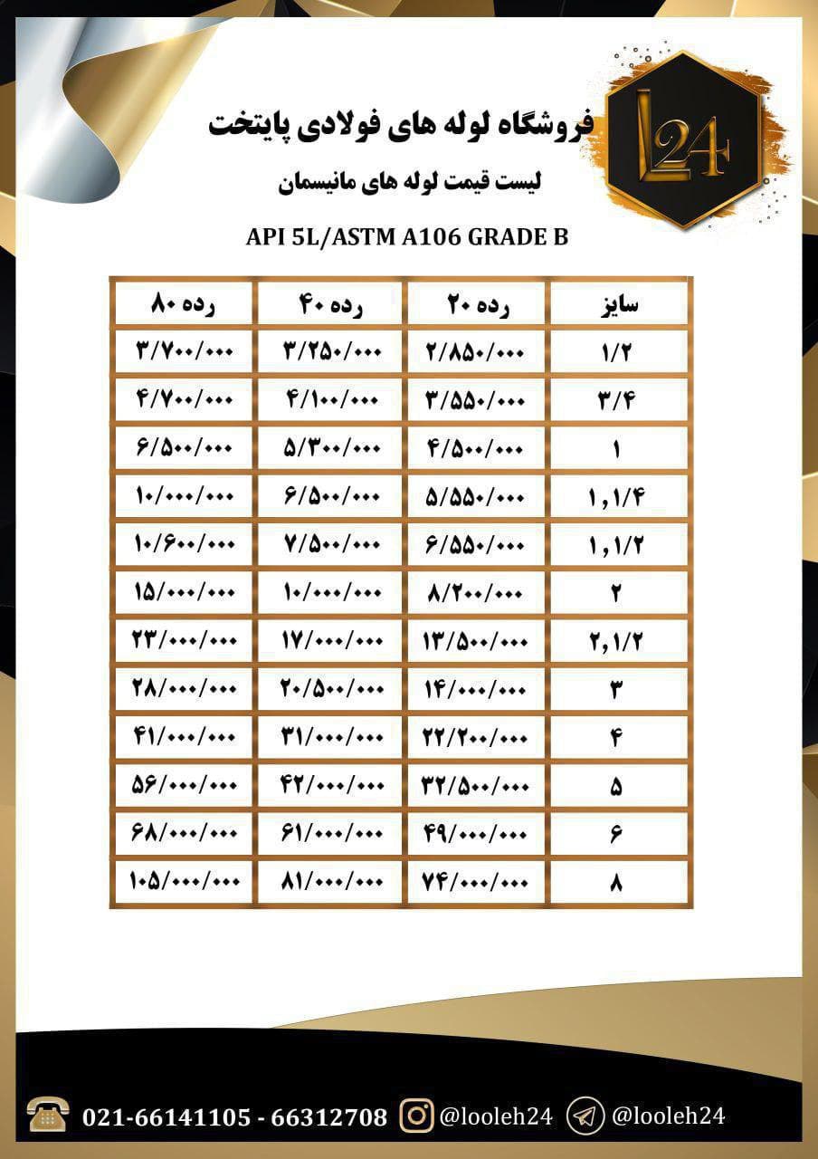 #لوله_مانیسمان #لوله_بدون_درز #وارداتی #رده_۲۰ (قیمت شاخه) مانیسمان "۱/۲ ___ ۳،۳۵۰،۰۰۰ مانیسمان "۳/۴ _ ۴،۳۰۰،۰۰۰ مانیسمان "۱ __ ۴،۵۰۰،۰۰۰ مانیسمان "۱/۴ ۱ ____ ۵،۹۰۰،۰۰۰ مانیسمان "۱/۲ ۱ ____ ۶،۹۵۰،۰۰۰ مانیسمان "۲ __ ۸،۴۶۰،۰۰۰ مانیسمان "۱/۲ ۲ _ ۱۳،۹۰۰،۰۰۰ مانیسمان "۳ __ ۱۴،۵۵۰،۰۰۰ مانیسمان "۴ __ ۲۲،۸۵۰،۰۰۰ #رده_۴۰ (قیمت شاخه) مانیسمان "۱/۲ __ ۳،۴۵۰،۰۰۰ مانیسمان "۳/۴ __ ۴،۵۴۰،۰۰۰ مانیسمان "۱ ____ ۵،۴۵۰،۰۰۰ مانیسمان "۱/۴ ۱ __ ۶،۳۰۰،۰۰۰ مانیسمان "۱/۲ ۱ __ ۷،۶۵۰،۰۰۰ مانیسمان "۲ ___ ۱۰،۴۰۰،۰۰۰ مانیسمان "۱/۲ ۲ ____ ۱۷،۴۰۰،۰۰۰ مانیسمان "۳ __ call مانیسمان "۴ __ call #رده_۸۰ (قیمت شاخه) مانیسمان "۱/۲ _ ۳،۹۵۰۰،۰۰۰ مانیسمان "۳/۴ _ ۵،۰۰۰،۰۰۰ مانیسمان "۱ __ ۷،۱۰۰،۰۰۰ مانیسمان "۱/۴ ۱ ____ ۱۱،۶۰۰،۰۰۰ مانیسمان "۱/۲ ۱ ____ ۱۱،۵۰۰،۰۰۰ مانیسمان "۲ ___ ۱۶،۱۰۰،۰۰۰ مانیسمان "۱/۲ ۲ _ ۲۳،۶۰۰،۰۰۰ مانیسمان "۳ ____ call مانیسمان "۴ __ call ✅ ۶ متری ✅کلیه کالاها با تایید مجدد قیمت و موجودی می باشند. 📞 ۱۸۳۶ 📞 ۰۲۱۶۶۹۱۱۰۰۷ داخلی (۷۰۵)