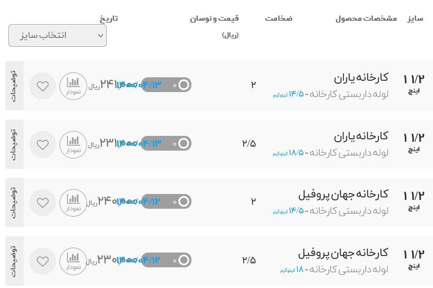 لوله ۴ اینچ (لوله ۱۱۴-لوله۱۱)ض۲ لوله داربستی ض۲ لوله داربستی ض۲/۵ لوله داربستی ض۳ لوله ۱/۲ ض ۲/۵ لوله ۳/۴ ض۲/۵ لوله ۳/۴ ض۲/۶۵ لوله ۳/۴ ض۲/۸ لوله ۳/۴ ض۳ ورق ۱*۲ض۲ ورق ۱۲۵۰*۲/۵ض۲ ورق ۱۲۵۰*۲/۵ ض۱/۲۵ روغنی ورق ۲/۵*۱۲۵۰ ض۲ گالوانیزه ورق ۲/۵*۱۲۵۰ ض۶۰ گالوانیزه