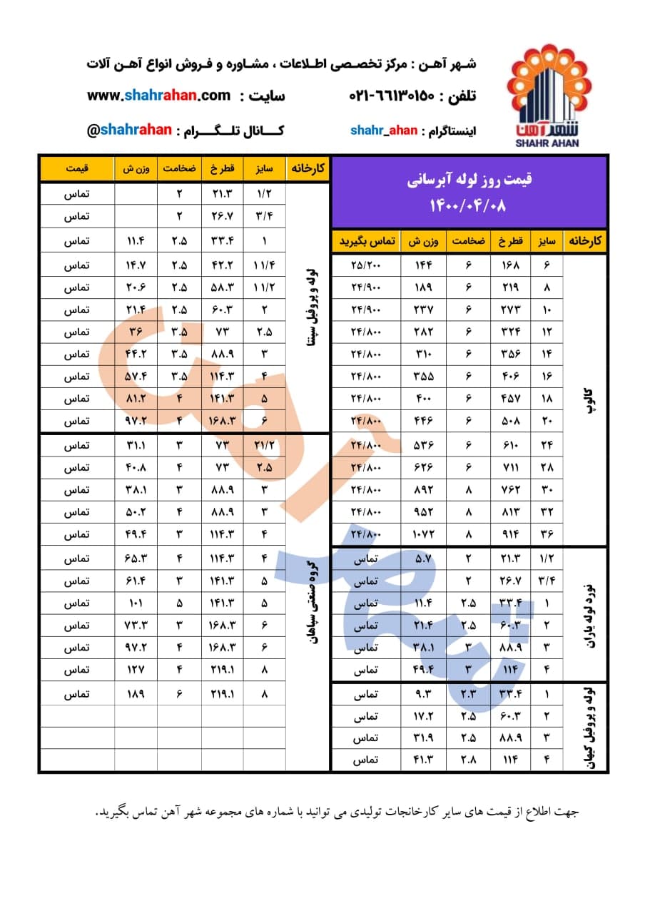 #لوله_داربستی کارخانه یاران 🗓 یکشنبه 13 تیر ماه 1400 🗓 ضخامت 2 میل: 24100 ضخامت 2.5 میل: 23100 📌ارتباط با کارشناسان فروش :👇🏻 ☎️ 021-54103