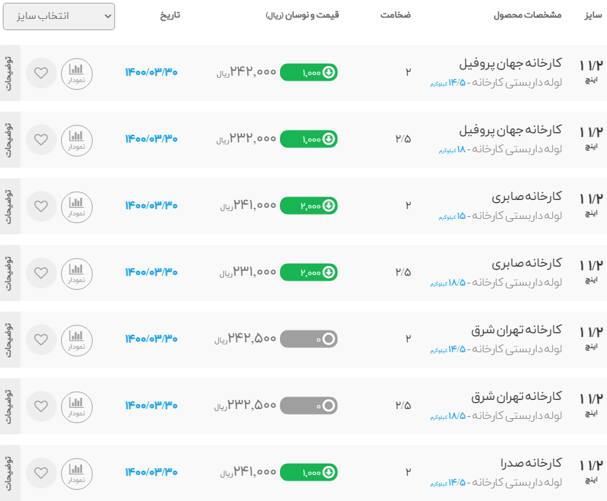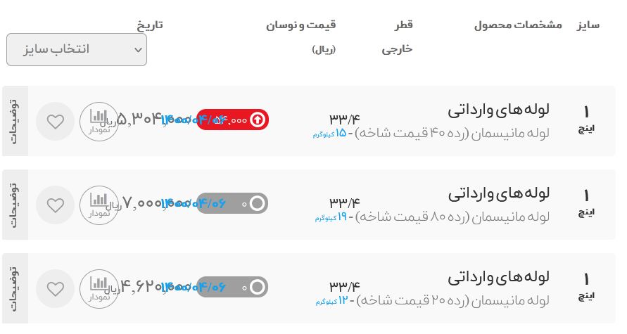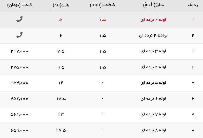 🗓 یکشنبه 6 تیر ماه 1400 🗓 💠 رده 80 (قیمت شاخه)💠 1/2 اینچ با قطر خارجی 21/3 : 394.000 3/4 اینچ با قطر خارجی 26/7 : 504.400 1 اینچ با قطر خارجی 33/4 : 700.000 11/4 اینچ با قطر خارجی 42/2 :1.107.600 11/2اینج با قطر خارجی48/3 : 1.144,500 2 اینچ با قطر خارجی 60/3 : 1.590,000 21/2 اینچ با قطر خارجی 73 : 2.350,000 3 اینچ با قطر خارجی 88/9 : 2.814.000 4 اینچ با قطر خارجی114/3 : 4.599.000 🔸