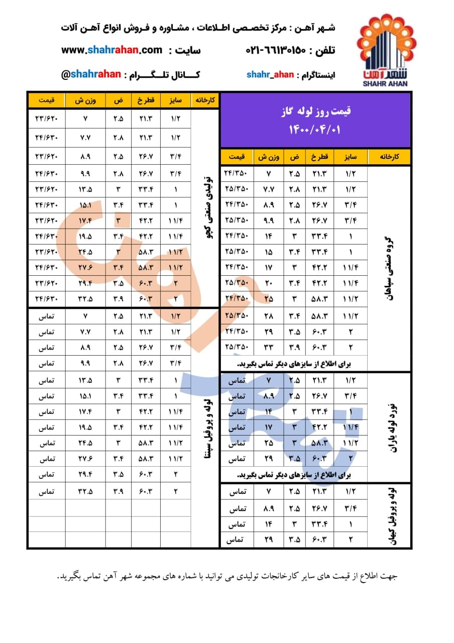 #لوله_داربستی کارخانه کیان پرشیا 🗓 یکشنبه 30 خرداد ماه 1400 🗓 کاهش 300 تومانی 🔻 ضخامت 2 میل: 24100 ضخامت 2/5 میل: 23100 📌ارتباط با کارشناسان فروش :👇🏻 ☎️ 021-54103 🌐 ahanprice.com 🆔 @ahanprice