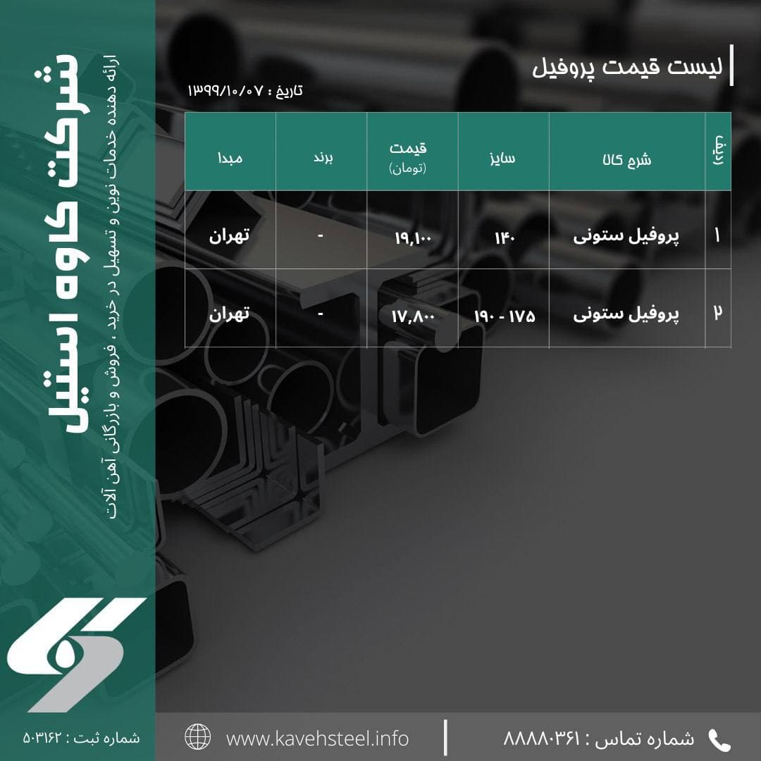[ Photo ] 📌لیست قیمت #پروفیل ستونی (تهران) 🗓تاریخ : ۱۳۹۹/۱۰/۰۷ شماره های تماس : 📞 02188880361 📞02188782852 @steel_kaveh