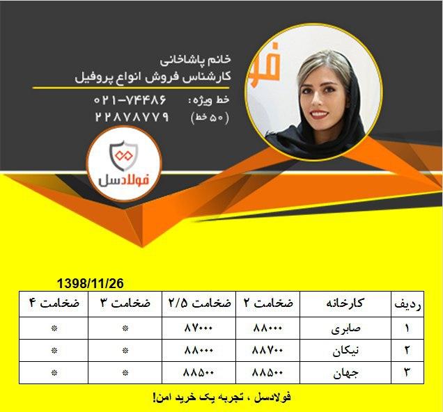 آهن کوعزیزی شنبه : ۱۳۹۸/۱۱/۱9 فروش پروفیل پرو فیل: ۲۵*۲۵*۲/۵ پروفیل :۷۰*۷۰*۲/۵ پروفیل :۶۰*۴۰*۲ پروفیل :۲۰*۲۰*۲ قیمت : تلفنی ۰۳۱۳۱۳۱۹۶۰۰ 09134890341