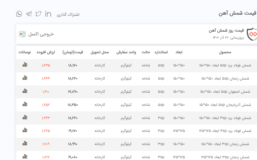مشتريان گرامي قيمت ضايعات ذوبي از مورخه 1402/09/22به شرح ذيل مي باشد 1-روغنی نرمه 16600 2-روغنی ضخیم 16600 3-روغنی ریزبار و پولکی 16600 4-گالوانيزه و ورق روكشدار خودرويي 16500 5-سوپر ويژه 16500 6-كلاف 16450 7-ويژه 16400 8-حلب 16400 9-سنگین یک و دو (زیر 50 سانت)،درب و پنجره 16000 10-سبک 15600 11-سفاله ریز بار 14700 12-سفاله پوشالی 14400 13-سفاله اتومات 7000 14-حلب قوطی فله 14600 15-آلیاژی 15450 16-چدن 15550