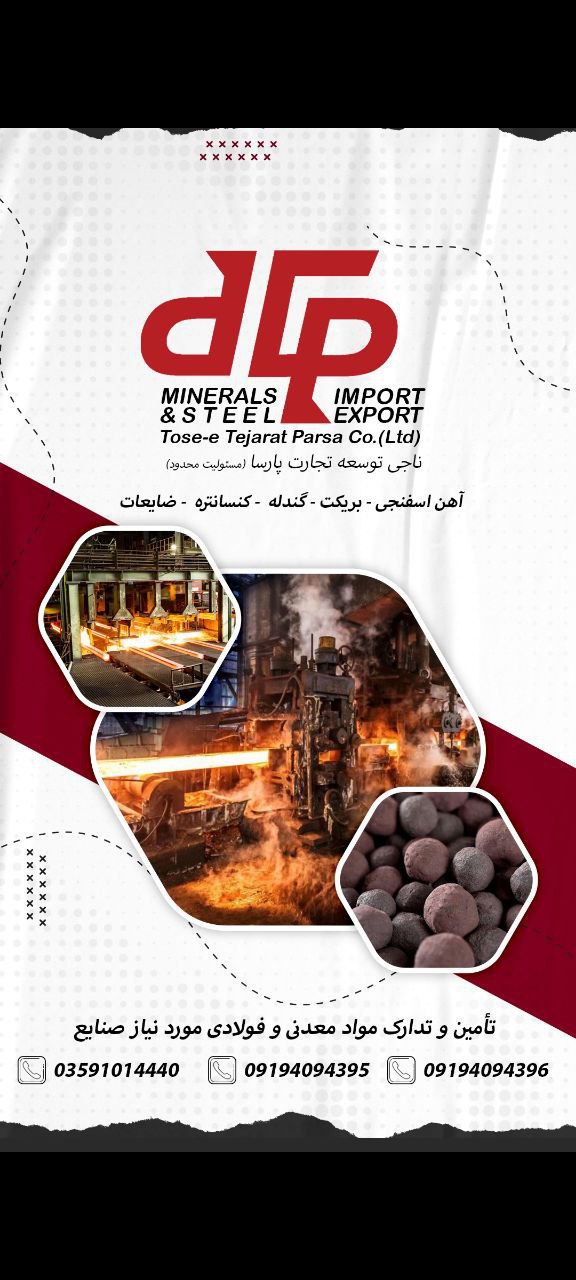 ⚜️ ناجی توسعه تجارت پارسا 💠بازرگانی ناجی توسعه تجارت پارسا فعال در زمینه بازرگانی 🔸مواد معدنی شامل: 🌀 آهن اسفنجی، بریکت، گندله، زغال سنگ، سنگ آهن، کنسانتره 🌀 ضایعات 🌀 شمش ✅ تامین کننده کلیه مقاطع فولادی 📢کسب اطلاعات بیشتر و ثبت سفارش تماس با تلفن : ☎️03591014440 🌐https://dtparsa.ir/ 🆔https://www.instagram.com/dtparsa_/ 📋https://foolad24.com/profile/14430