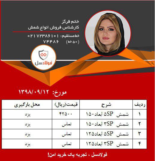 کارخانه 10 شمس: 12 شمس:. A3 14 شمس: 16 شمس: 18 شمس: 20 شمس: توافقی جهت دریافت قیمت نهایی تماس بگیرید. 03133111278 03133989502 03136619727 03136055395