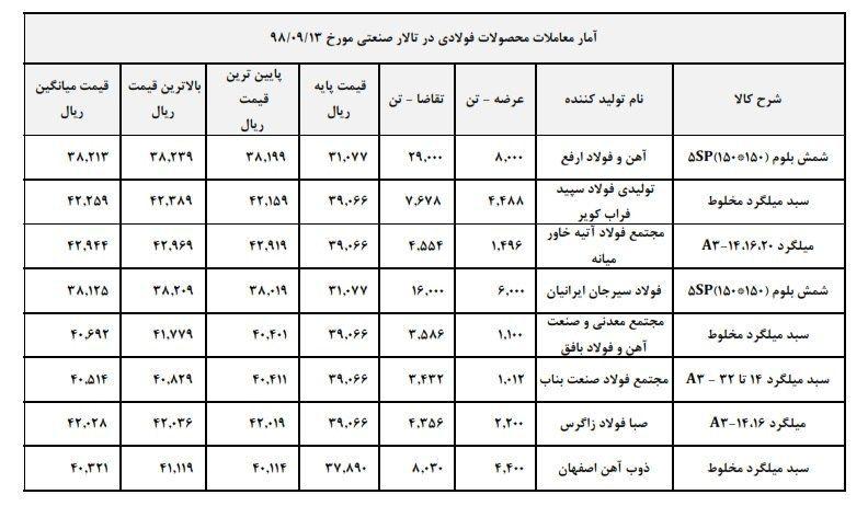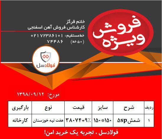 چهار شنبه۹۸/۰۹/۰6 عرضه محصولات فولادی شرکت کوثر فولادمیهن شمش القایی125*125 ۴۱۲۰ تومان (۵spغیر رسمی) بارگیری از اصفهان