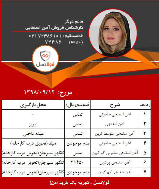 چهار شنبه۹۸/۰۹/۰6 عرضه محصولات فولادی شرکت کوثر فولادمیهن آهن اسفنجی آب خورده : 1070+9% بارگیری از اصفهان