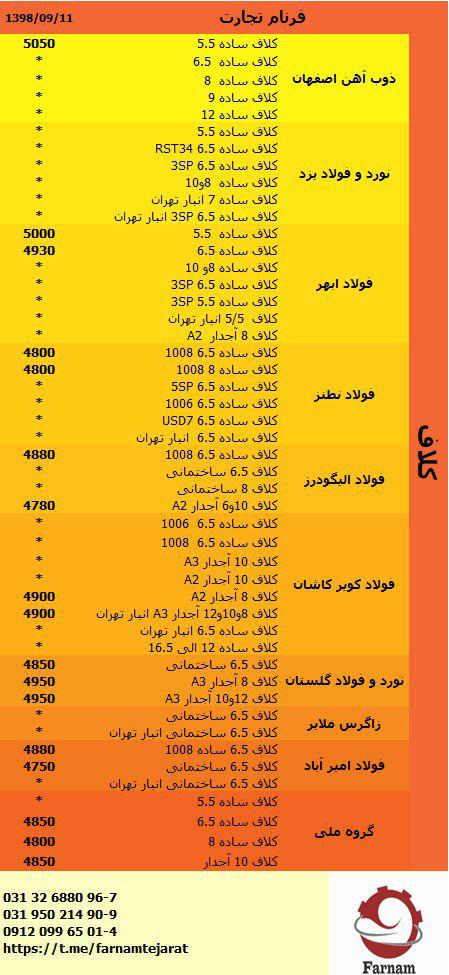 به نام خدا 1398/9/12 کارخانه 10 میانه: 12 میانه: 14 الی 28 میانه: 32 میانه: جهت دریافت قیمت تماس بگیرید. 03133111278 03133989502