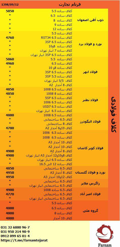 کارخانه 8 فولاد راد همدان:4825 10 فولاد راد همدان:4795 12 فولاد راد همدان:4745. 14 فولاد راد همدان:4695 16 فولاد راد همدان:4695 18 فولاد راد همدان:4695 20 فولاد راد همدان:4695 22 فولاد راد همدان:4695 25 فولاد راد همدان:4725 28 فولاد راد همدان:4725 32 فولاد راد همدان: 03133111278 03133989502 03136619727