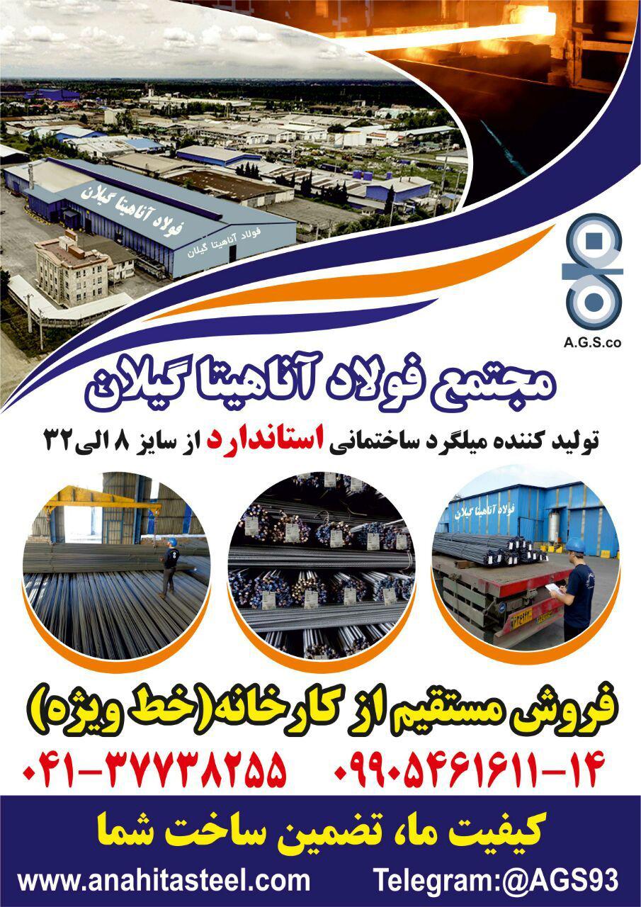 فولاد آناهیتا گیلان فروش از کارخانه ۰۴۱۳۷۷۳۸۲۵۵ خط ويژه چهارشنبه ۹/۶ میلگرد های موجود ۸ : ۴۷۲٠٠ ۱۰ : ۴۶۷۰۰ ۱۲ : ۴۶۲۰۰ ۱۴ : ۴۶۲۰۰ ۱۶ : ۴۶۲۰۰ ۱۸ : ۴۶۲۰۰ ۲۰ : ۴۶۲۰۰ ۲۲ : ۴۶۲۰۰ ۲۵ : ۴۶۲۰۰ ۲۸ : ۴۶۲۰۰ ٣٢ : ۴۶۲۰۰ با تاييد * پذیرش سفارش میلگرد A4