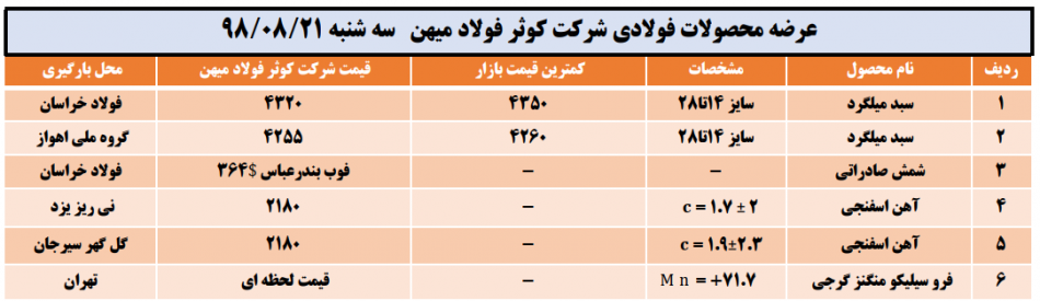 (آريا لوتوس نويد فولاد کیان کاشان: ثابت میلگرد ۸ ۴۶۱۰ فولاد سپهر ایرانیان : ثابت میلگرد ۸ ۴۶۱۰ تومان