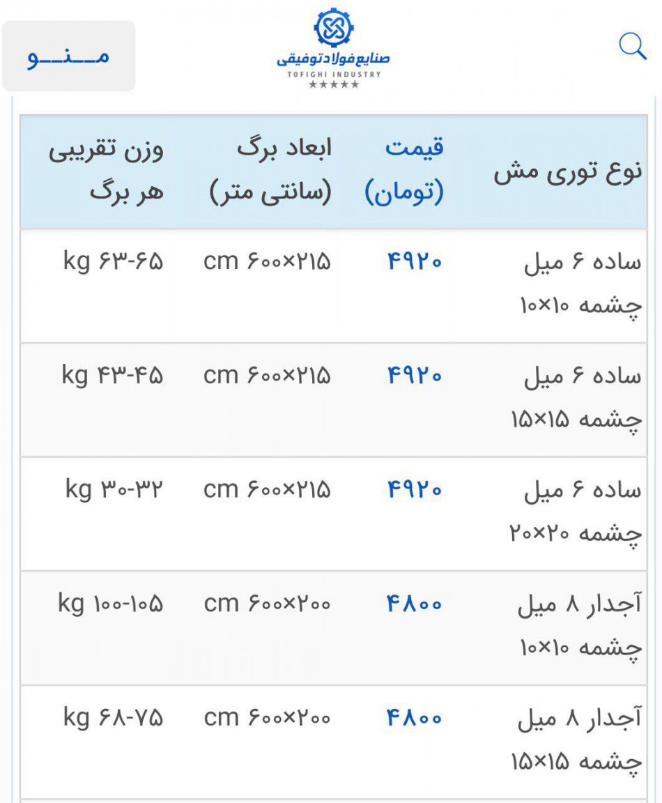 توری مش 8 و 10 فابريك در چشمه های 10 15 و 20 سفارشات پذيرفته مي شود صنایع فولاد توفیقی لطفا برای تایید قیمت نهایی با ما تماس بگیرید 021555 11 559 02155449768 09123955406 09123001732 https://t.me/fouladtofighi www.fouladtofighi.com
