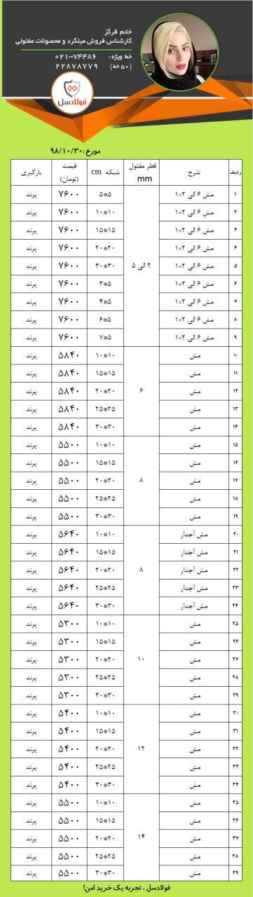 مش ١٠*١٠*١٢ ١٥*١٥*١٢ ٢٠*٢٠*١٢ ٢٥*٢٥*١٢ ٣٠*٣٠*١٢ قيمت ۵۴۳۰ مش ١٠*١٠*١٤ ١٥*١٥*١٤ ٢٠*٢٠*١٤ ٢٥*٢٥*١٤ ٣٠*٣٠*١٤ قيمت ۵۵۳۰ مش سبك از ٢/٥ الي۵ در شبکه های مختلف قیمت ۷۶۰۰