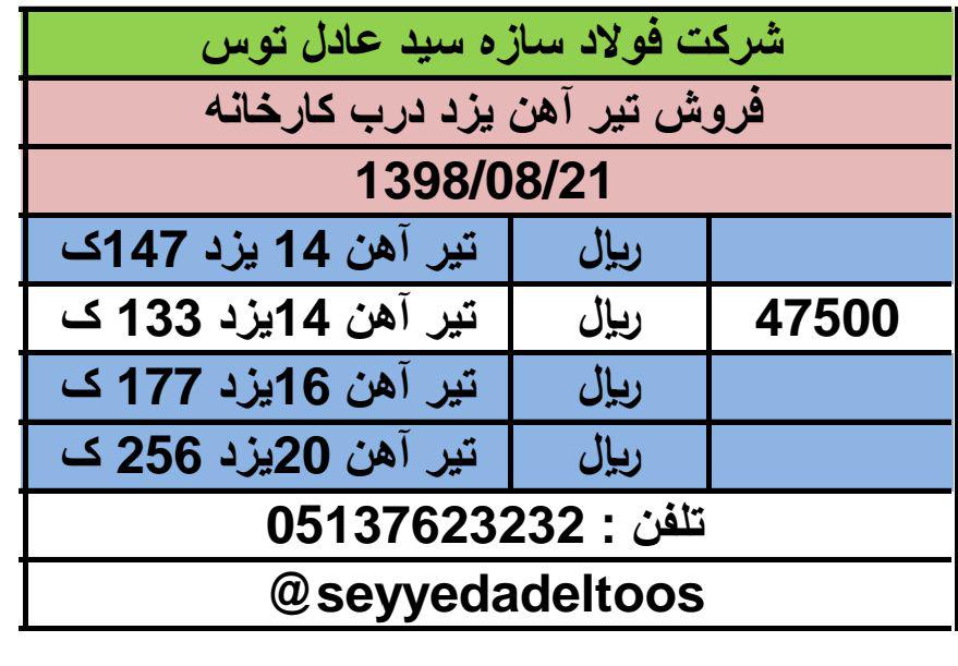 فولاد آناهیتا گیلان : ثابت میلگرد ۸ ۴۶۰۰ میلگرد ۱۰ ۴۵۵۰ میلگرد ۱۲ الی ۳۲ ۴۵۰۰