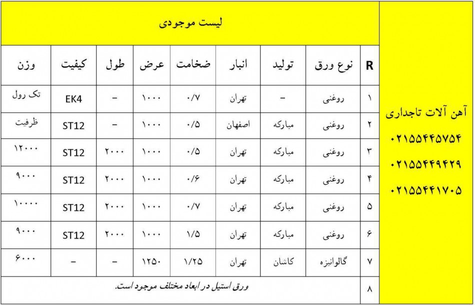 موجود بار سیاه فولاد مبارکه ۳سیاه عرض۱۰۰۰فولاد مبارکهst37 ۳سیاه عرض۱۲۷۵فولاد مبارکهst33 ۲/۷۵سیاه عرض۱۱۷۰فولاد مبارکهst37 ۴سیاه عرض۷۵۰فولاد مبارکهst33 ۴سیاه عرض۱۲۵فولاد مبارکهst24 ۳سیاه عرض۱۰۰۰فولاد مبارکهst24 انبار مبارکه