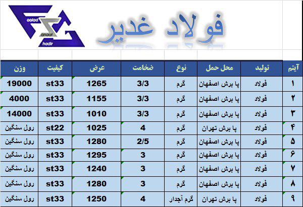 بارگیری از مشهد نبشی ۳ : ۴۵۵۰ نبشی ۴ : ۴۵۵۰ نبشی ۴گ۴: ۴۵۰۰ نبشی ۵ : ۴۵۵۰ نبشی ۶ نبشی ۸ : ۴۵۰۰ نبشی ۱۰ ناودانی ۶ : ۴۵۵۰ ناودانی ۸ : ۴۵۵۰ سپری ۴ سپری ۵ بارگیری از یزد نبشی ۸ : ۴۵۰۰ نبشی۱۰ : ۴۵۰۰ ناودانی ۱۰ : ۴۵۵۰ ناودانی ۱۲ : ۴۵۵۰ ناودانی ۱۴ : ۴۵۵۰ ناودانی ۱۶ : ۴۵۵۰ خط ویژه67931 021
