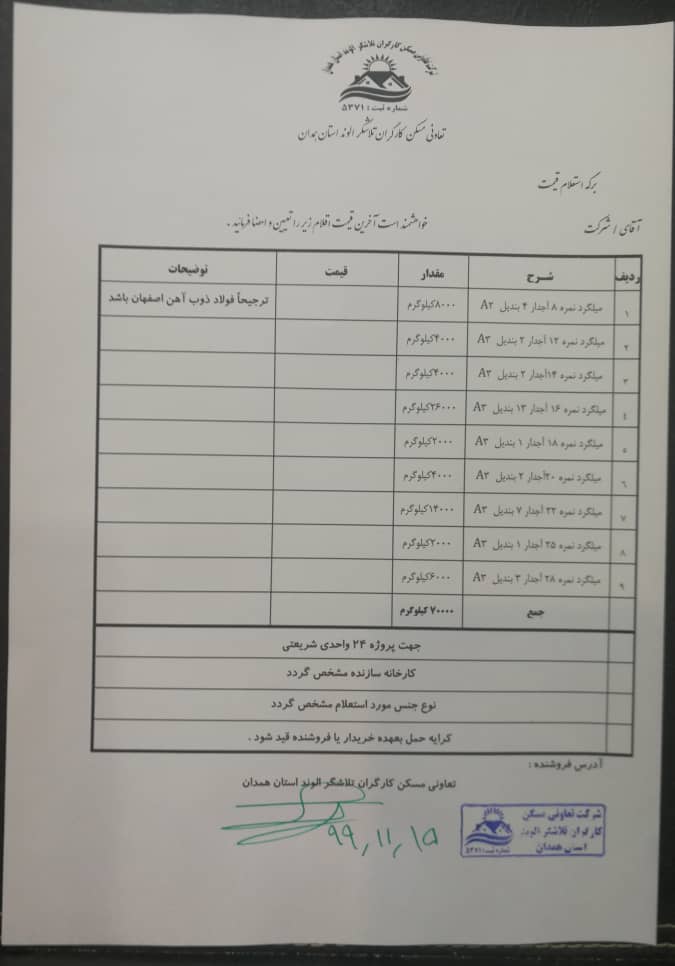 خریدار تعاونی مسکن کارگران تلاشگر الوند استان همدان میلگرد 70 تن جهت اطلاع از مقدار و گرید میلگردها ، لطفا فایل ارسالی را بررسی بفرمایید 09059089401