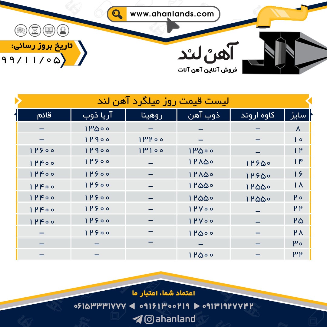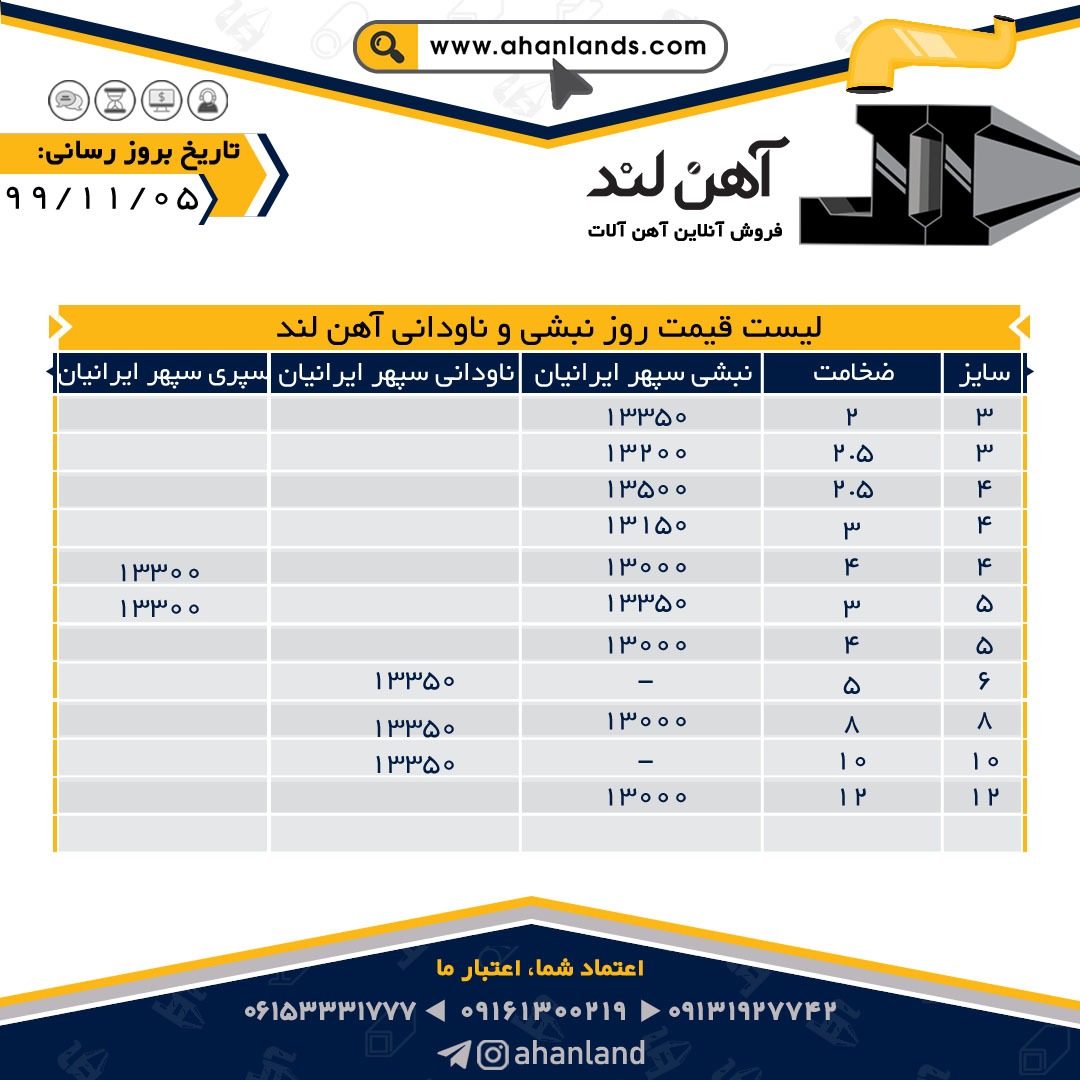 🔴آهن لند🔴 ⭕لیست قیمت انواع محصولات فولادی در تاریخ: 1399/11/05 برای مشاهده آنلاین قیمت انواع مقاطع فولادی به وب سایت WWW.AHANLANDS.COM مراجعه فرمایید. ⚜اعتما ...