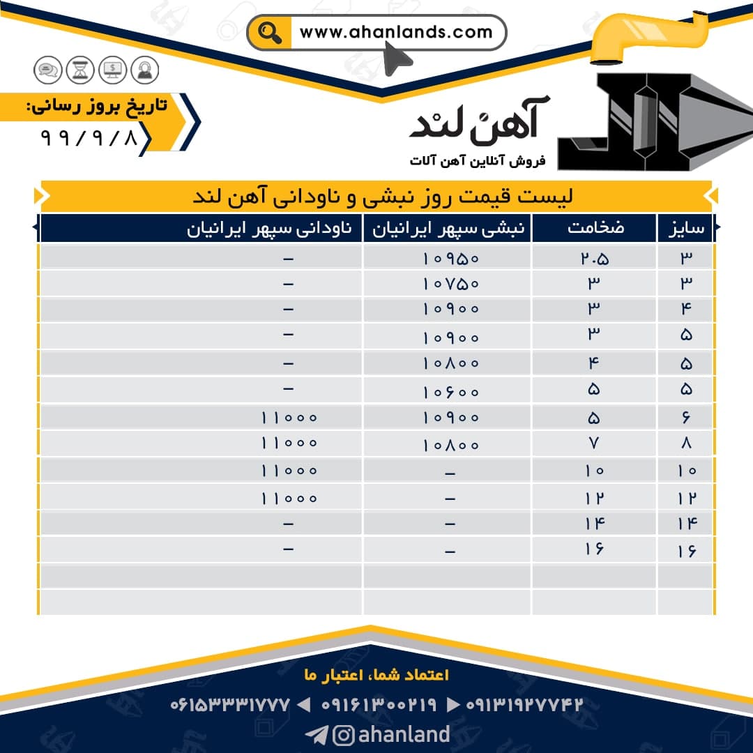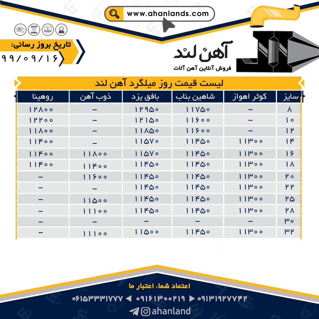 🔴آهن لند🔴 لیست قیمت انواع محصولات فولادی در تاریخ: 1399/09/16 ⭕برای مشاهده آنلاین قیمت انواع مقاطع فولادی به وب سایت ما: WWW.AHANLANDS.COM مراجعه فرمایید. ⚜اع ...