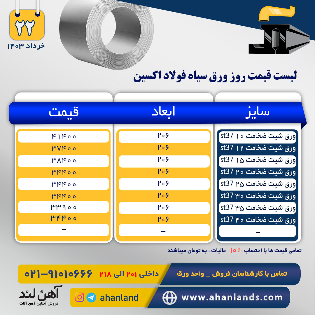 📢#ورق_سیاه_اکسین 🗓چهارشنبه 1403/03/23 🚛بارگیری #کارخانه 🔸ثابت ورق ضخامت 10 میل شیت 6*2 ⬅️ 41400 تومان ✅ مشاهده ادامه لیست قیمت ها: https://ahanlands.com/man ...