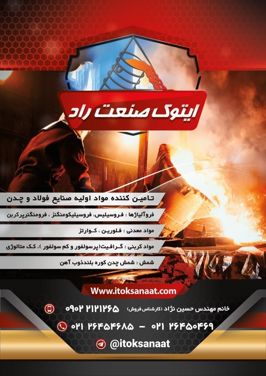 ⭕️بازرگانی ایتوک صنعت راد 🔹تامین کننده مواد اولیه صنایع فولاد و چدن 🔸فروآلیاژها: فروسیلیس، فروسیلیومنگنز، فرو منگنز پرکربن 🔸مواد معدنی : فلورین ، کوارتز ...