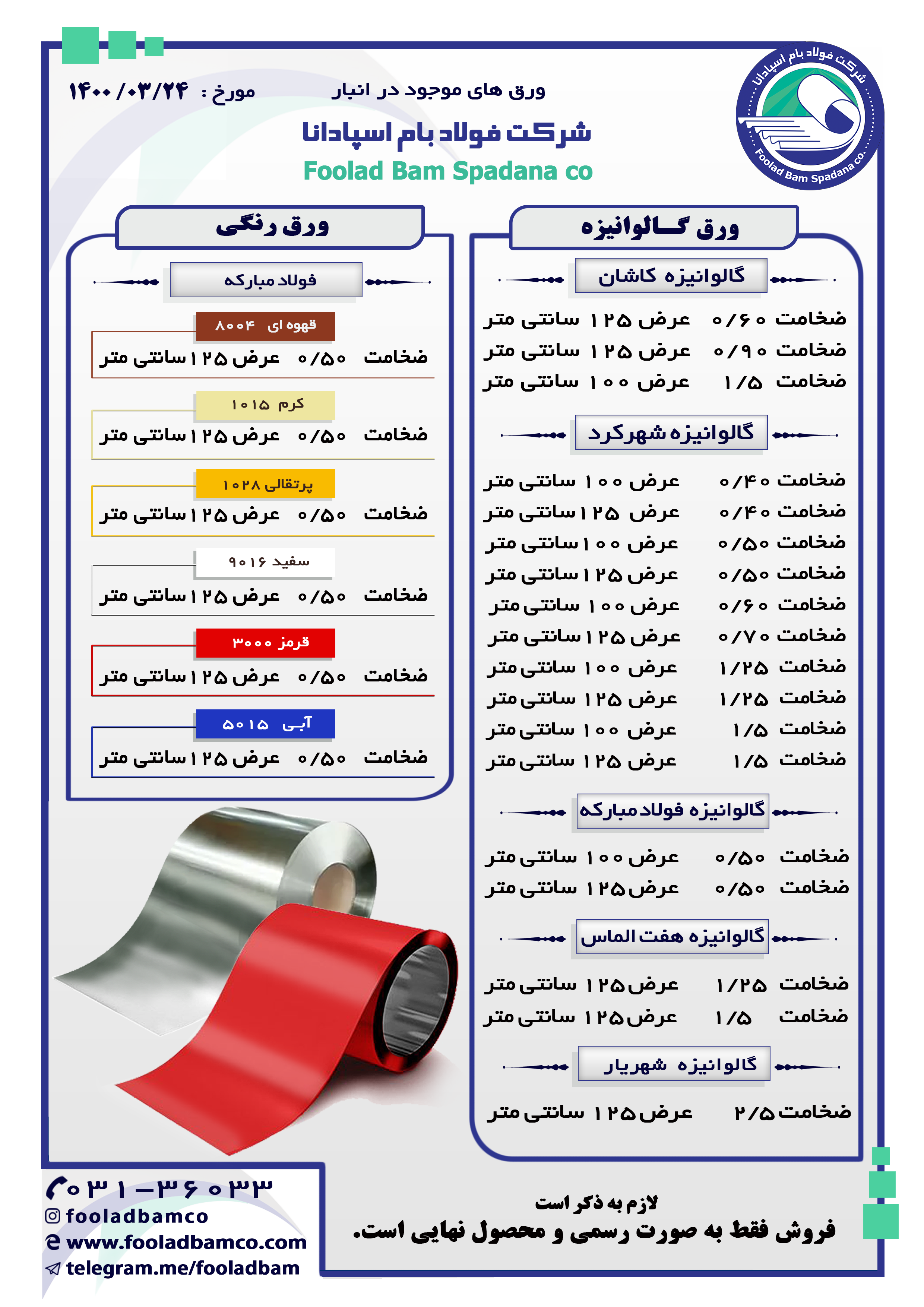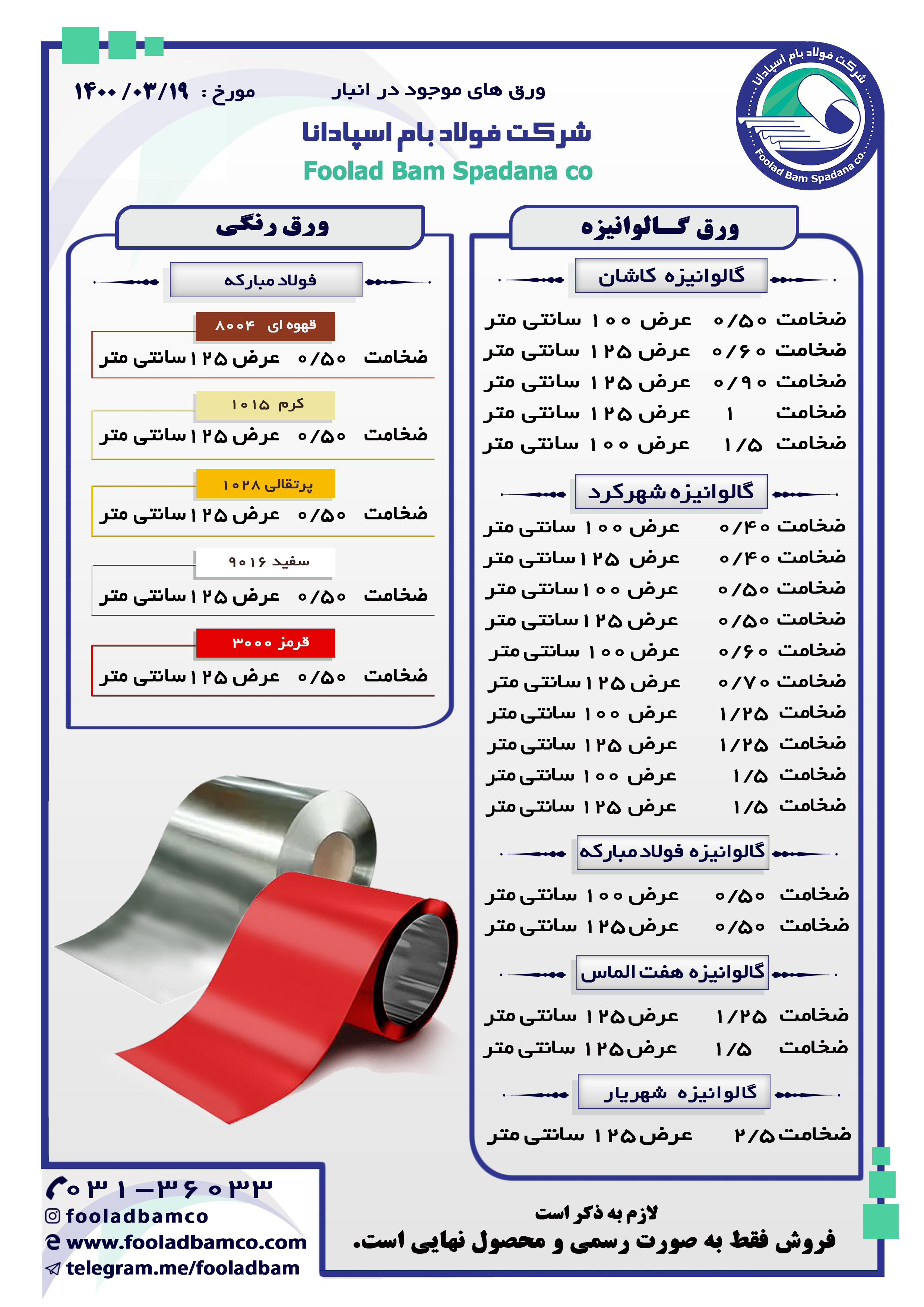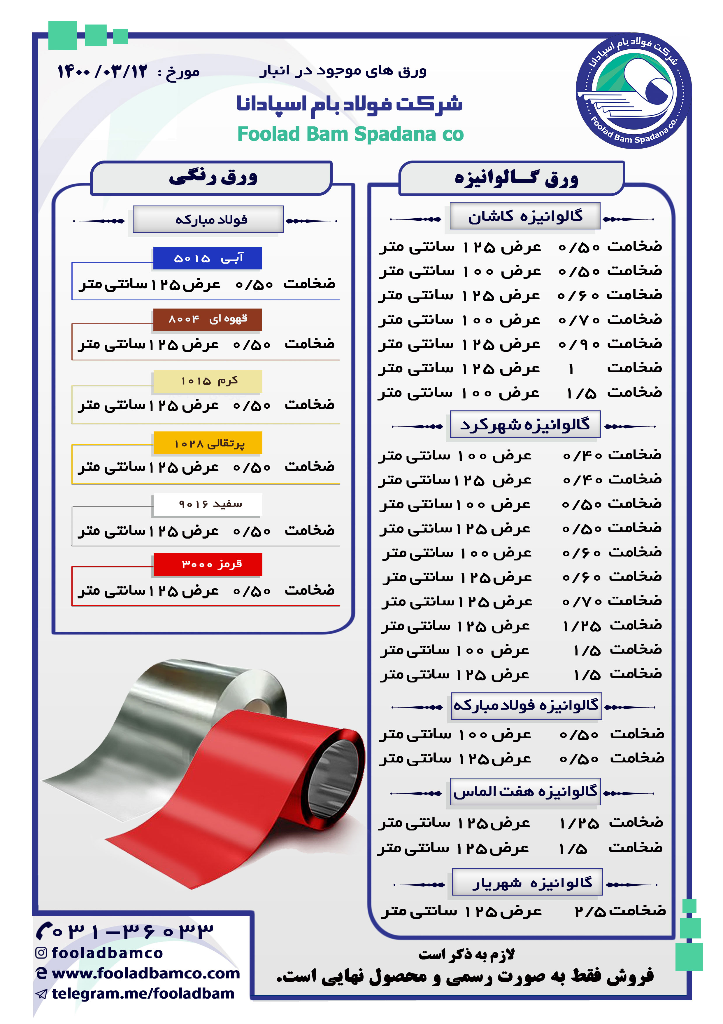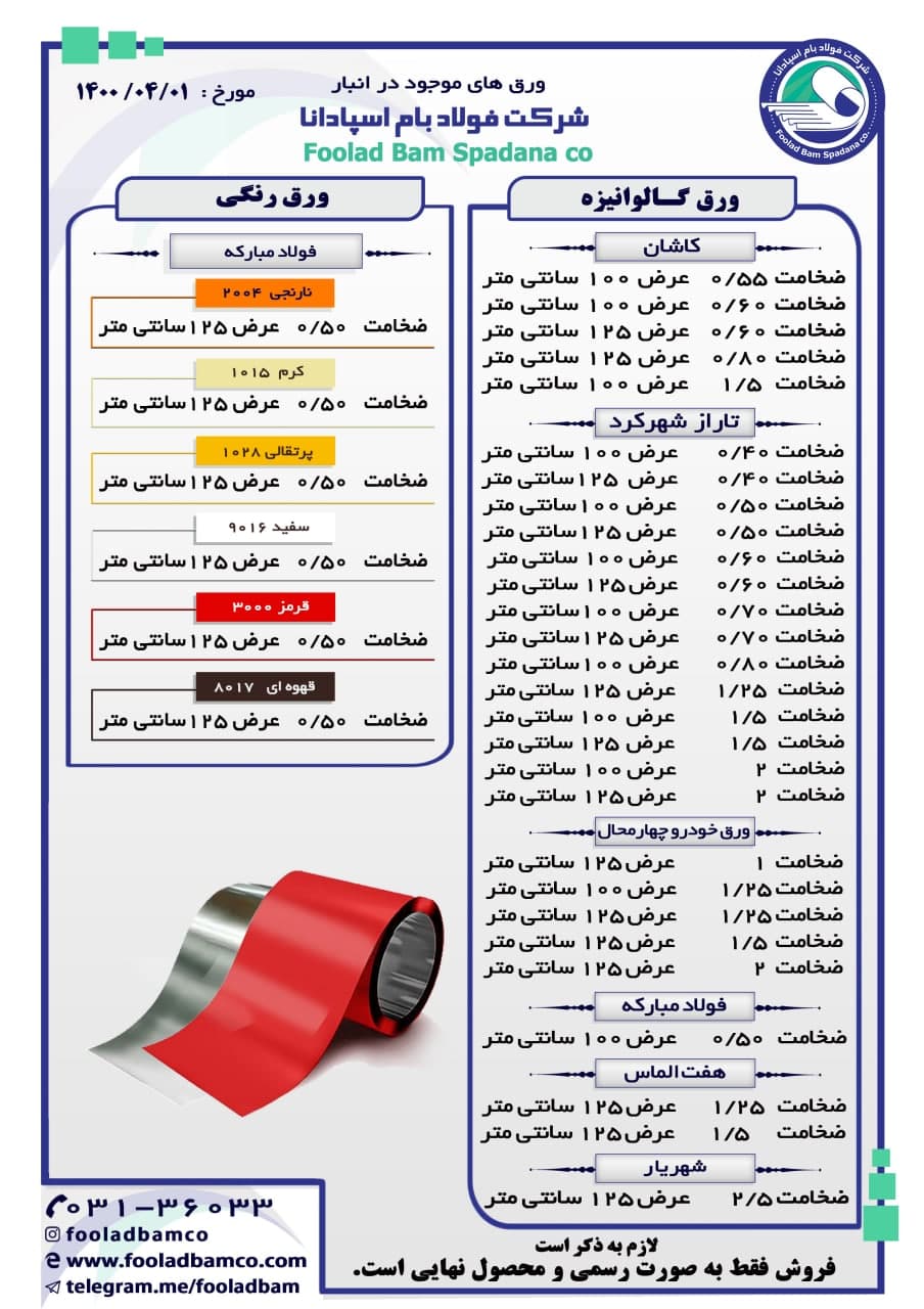 موجودی انبار شرکت فولاد بام اسپادانا ارتباط با واحد فروش : ☎️ 031-36033
