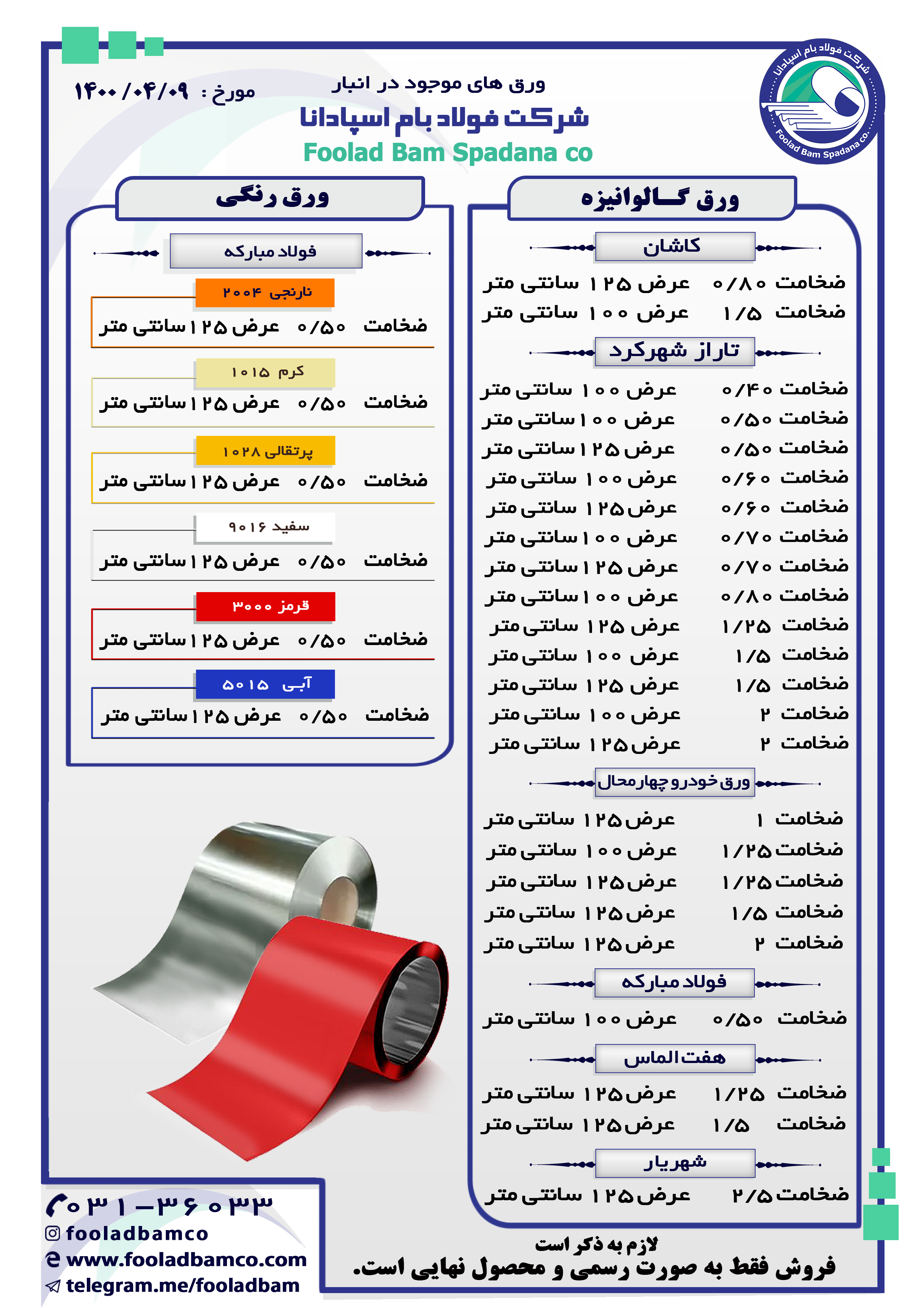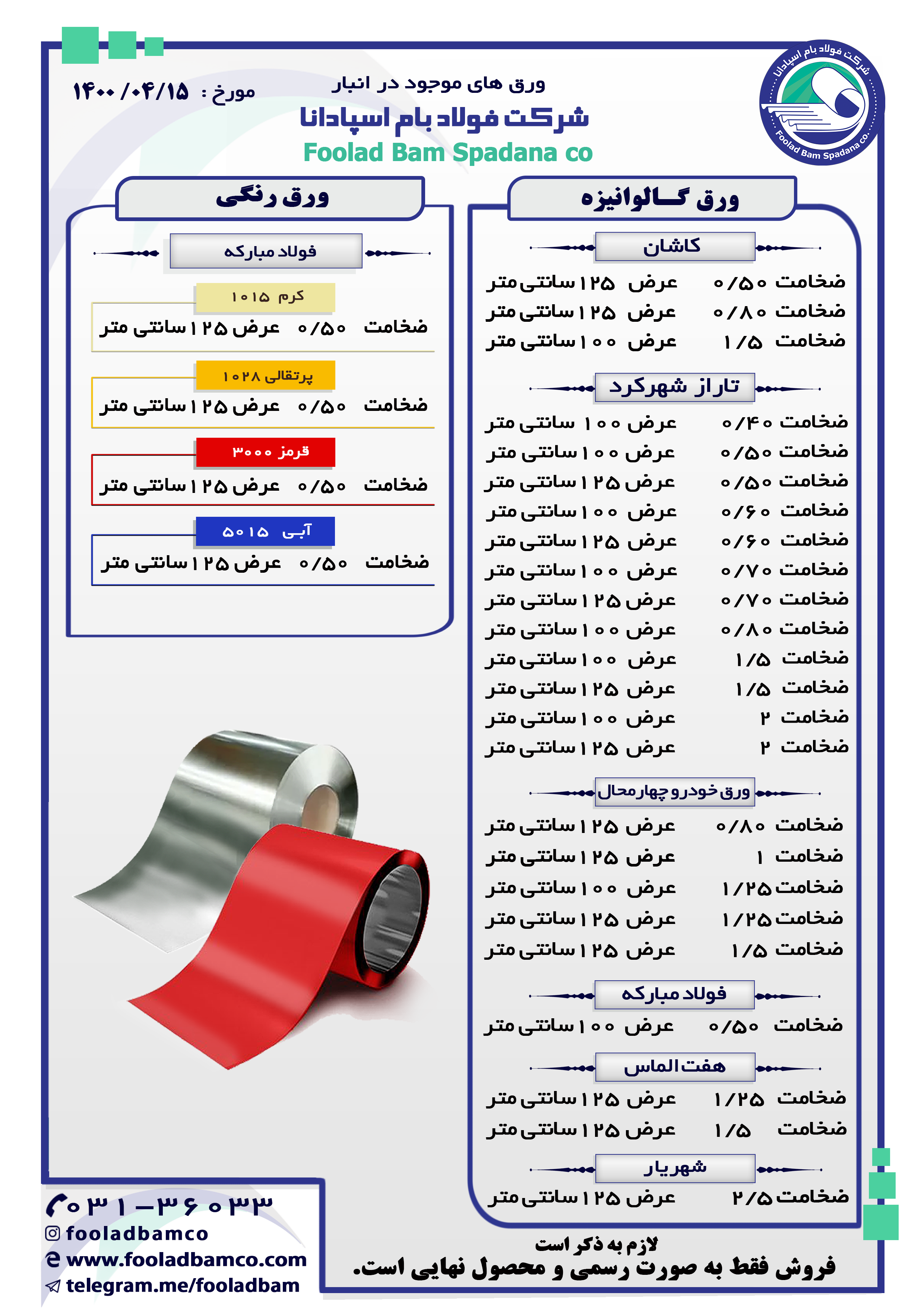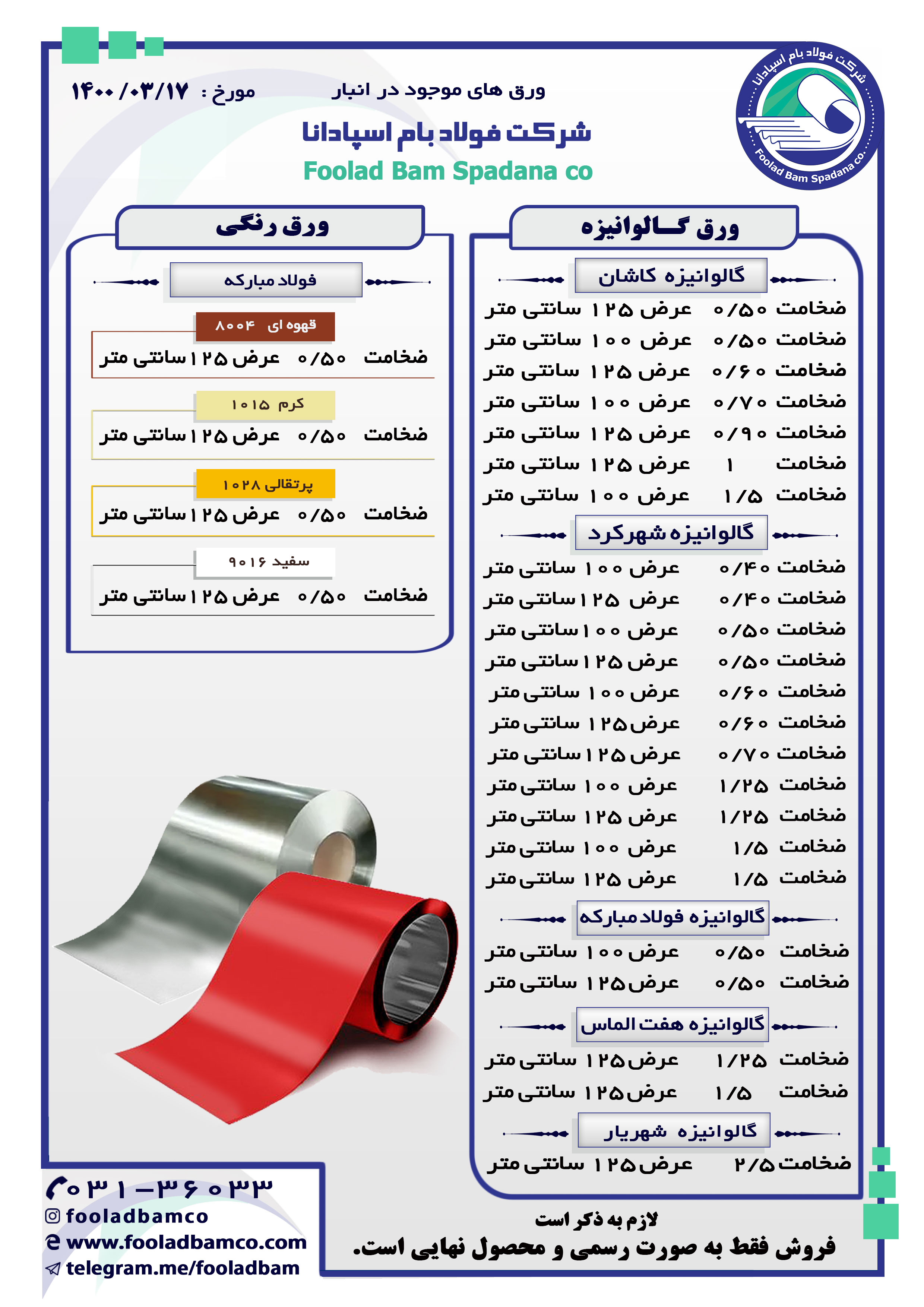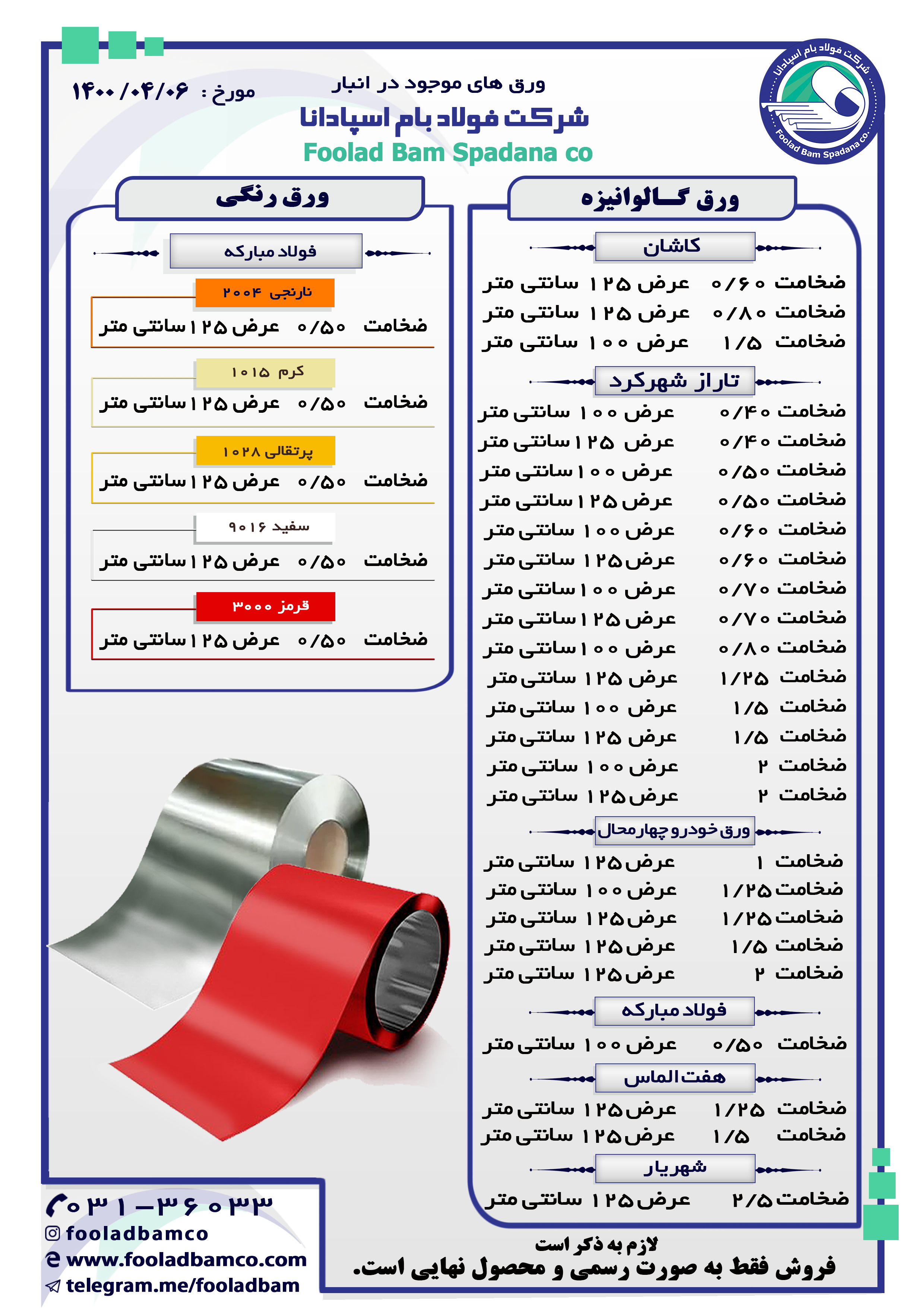 موجودی انبار شرکت فولاد بام اسپادانا ارتباط با واحد فروش : ☎️ 031-36033