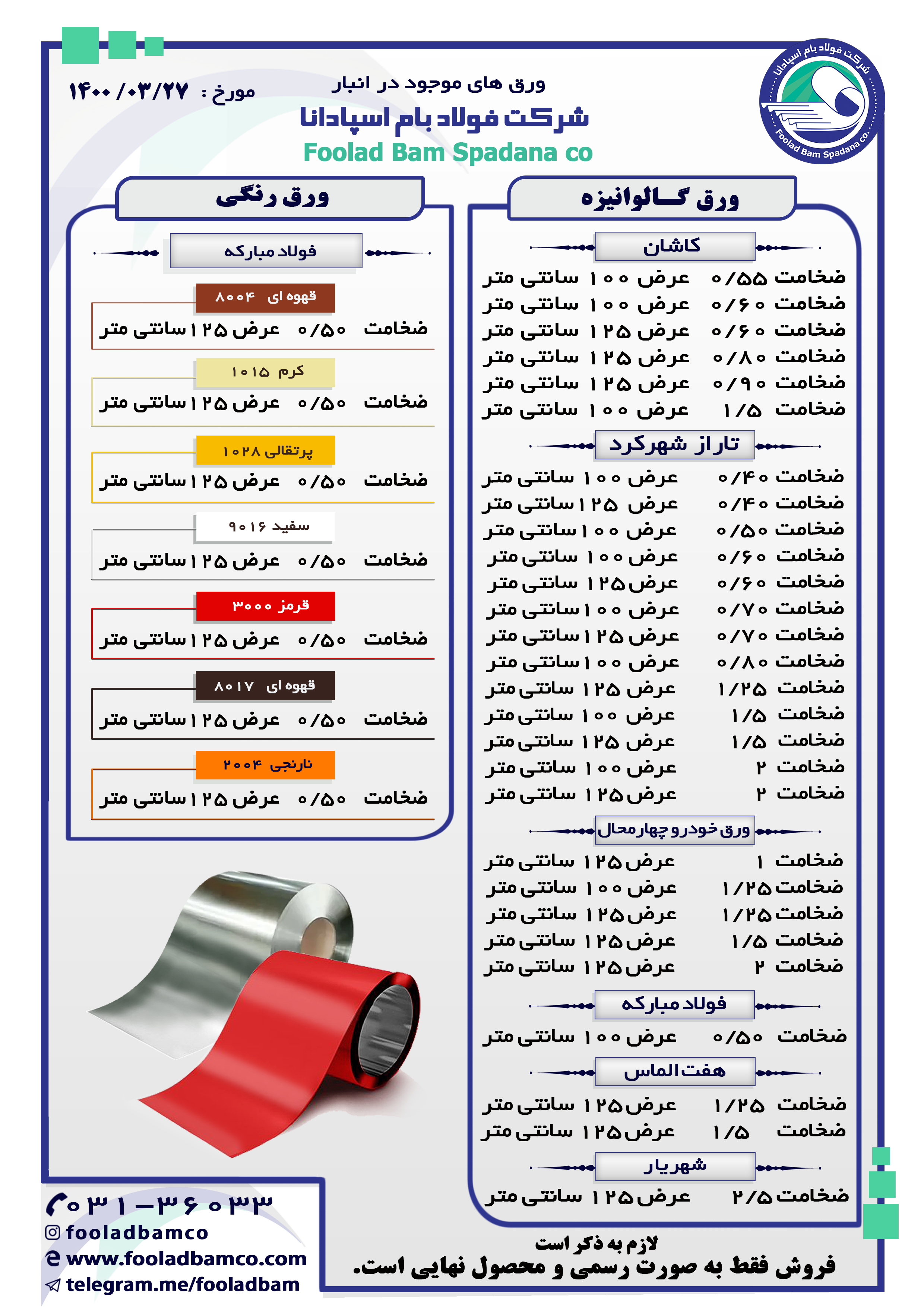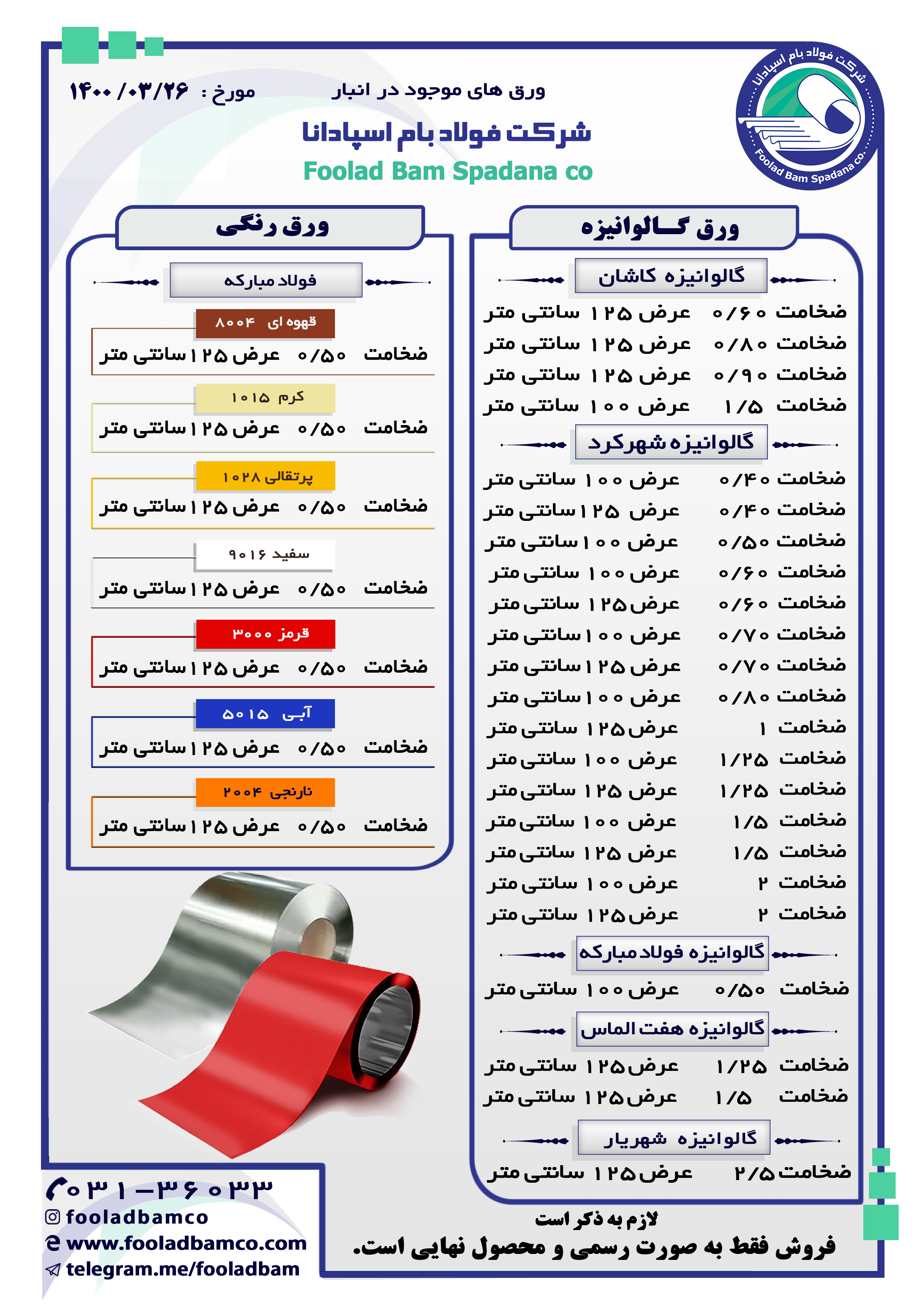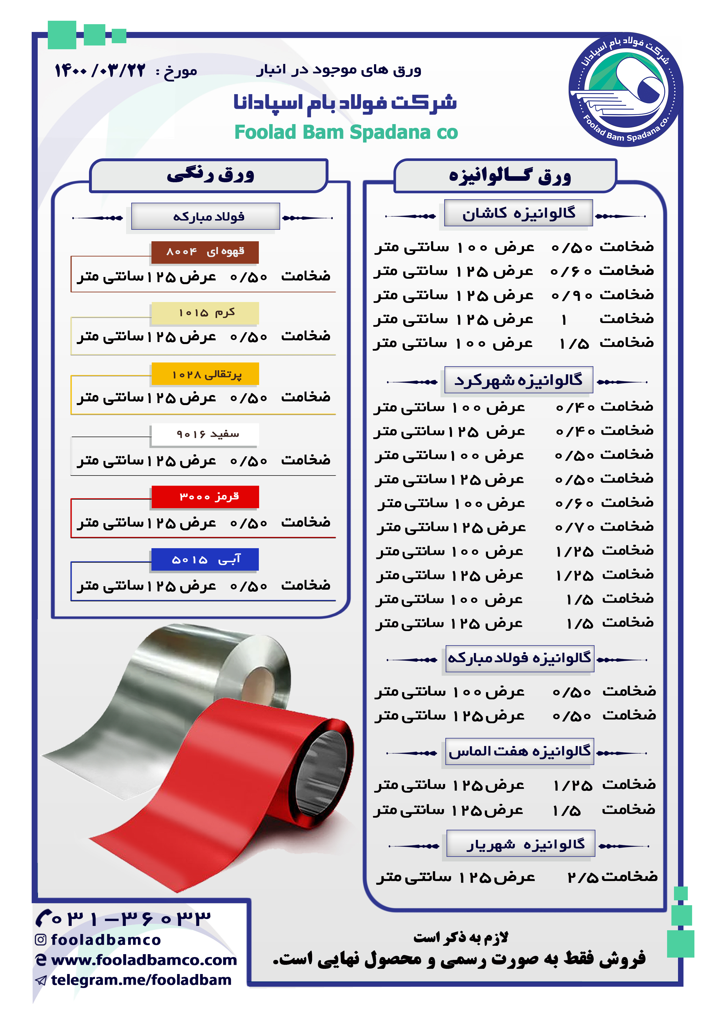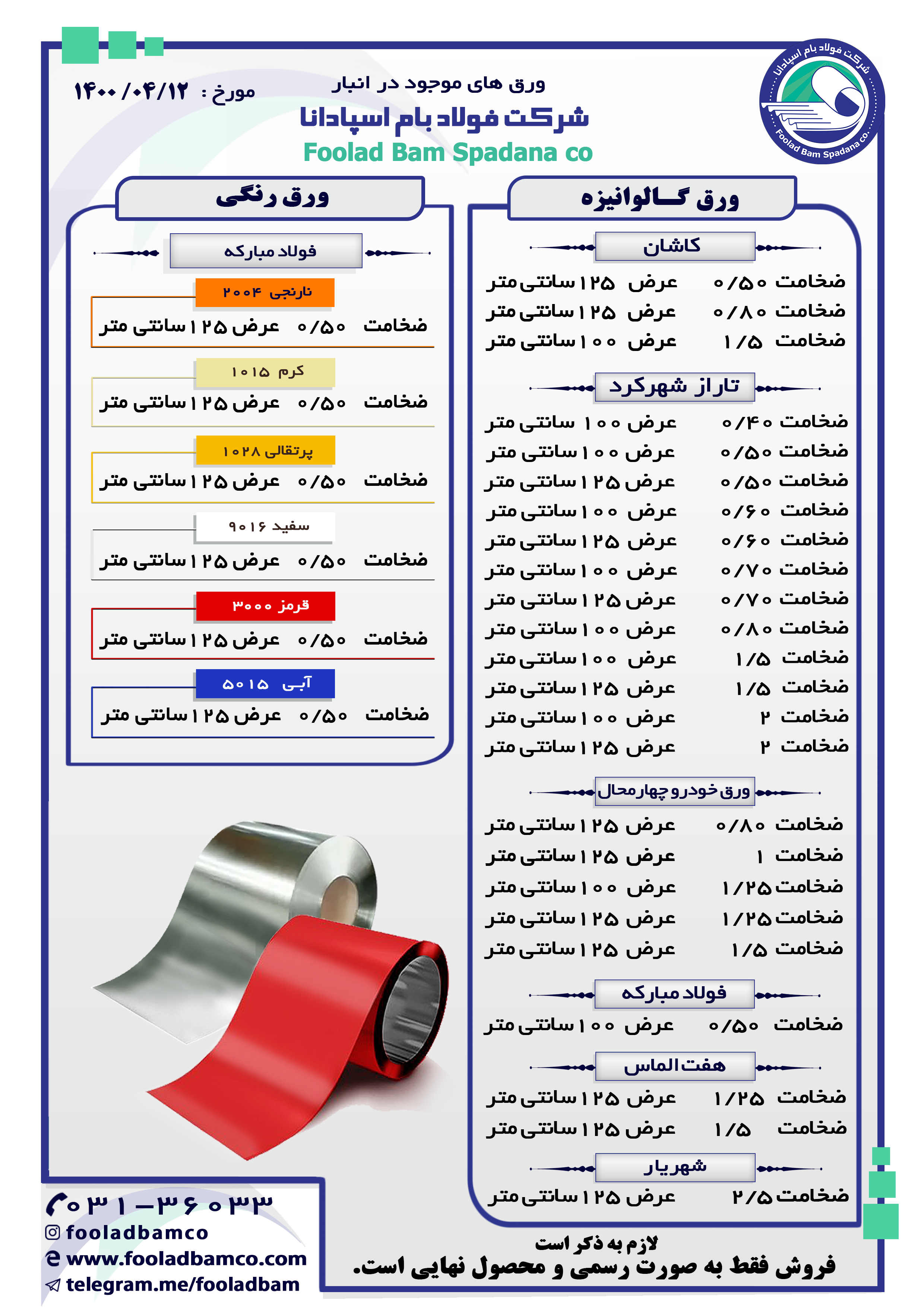 موجودی انبار شرکت فولاد بام اسپادانا ارتباط با واحد فروش : ☎️ 031-36033