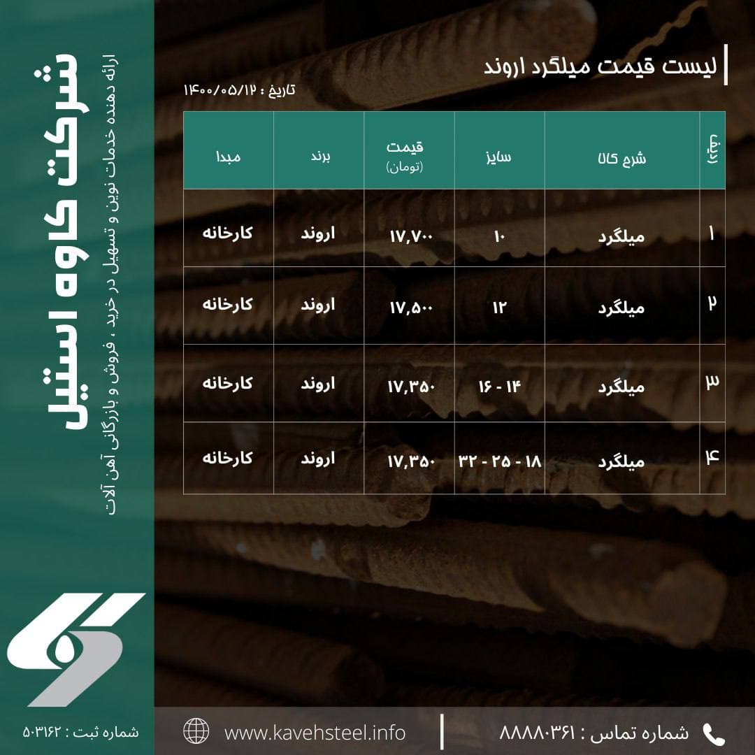 📌لیست قیمت #میلگرد (اروند) - کارخانه 🗓تاریخ : ۱۴۰۰/۰۵/۱۷ شماره های تماس : 📞 02188880361 📞02188780310