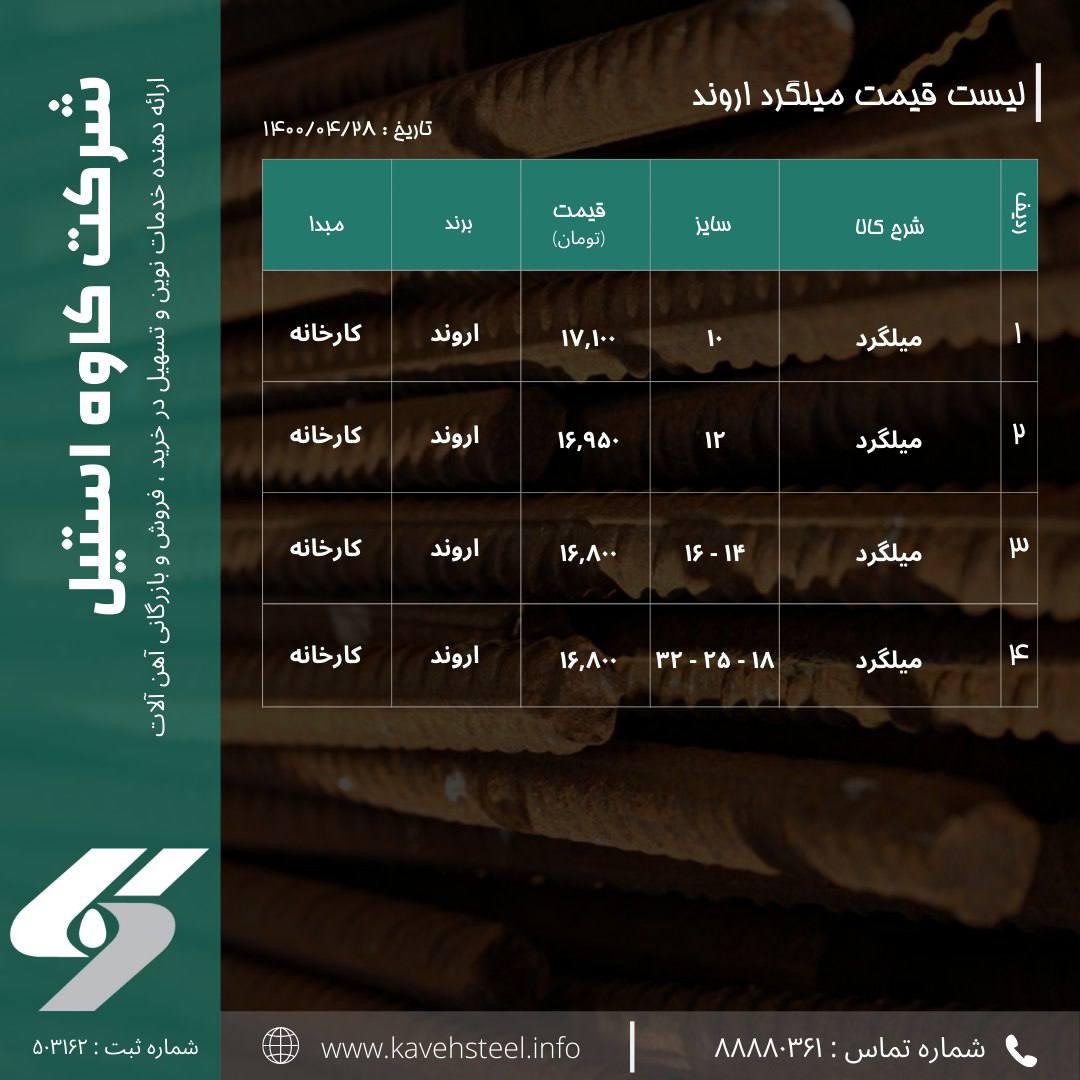 📌لیست قیمت #میلگرد (اروند) - کارخانه 🗓تاریخ : ۱۴۰۰/۰۴/۲۸ شماره های تماس : 📞 02188880361 📞02188780310