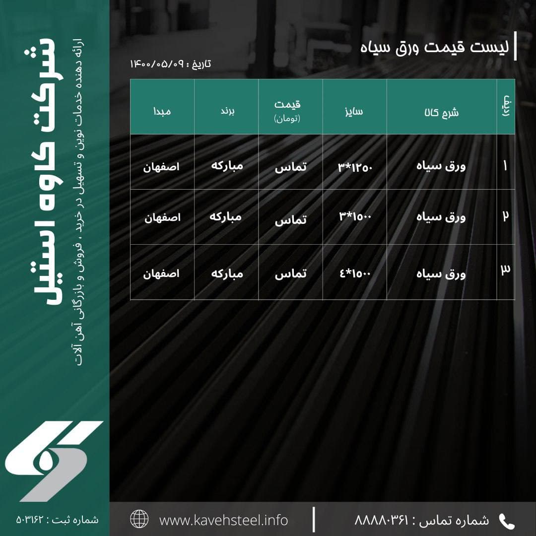 📌لیست قیمت #ورق_سیاه (مبارکه) - اصفهان 🗓تاریخ : ۱۴۰۰/۰۵/۰۹ شماره های تماس : 📞 02188880361 📞02188782852
