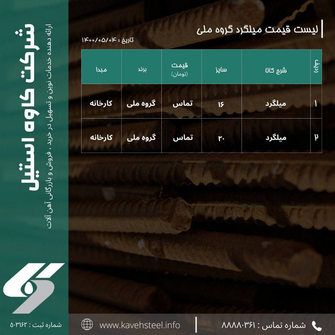 📌لیست قیمت #میلگرد (گروه ملی) - کارخانه 🗓تاریخ : ۱۴۰۰/۰۵/۰۴ شماره های تماس : 📞 02188880361 📞02188780310