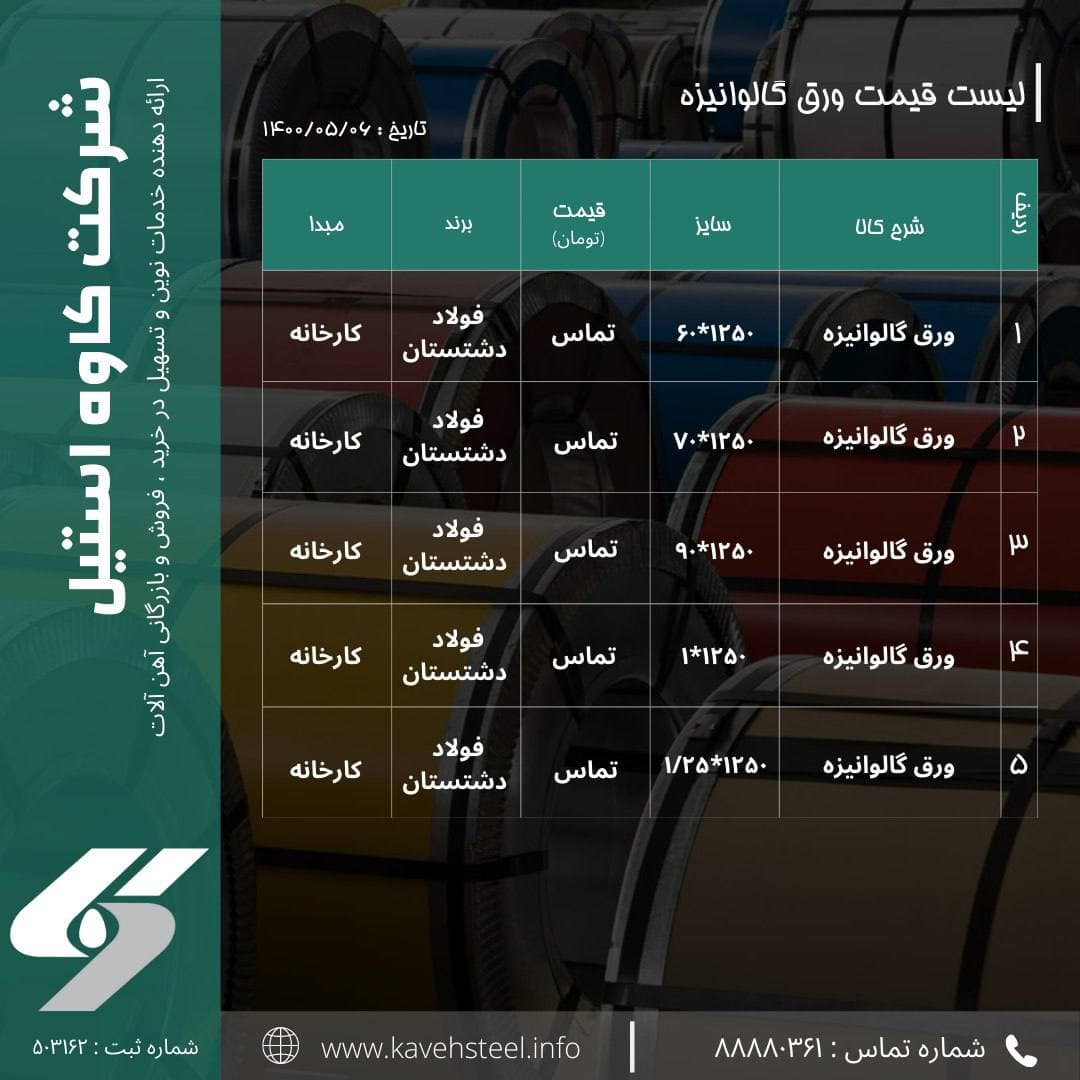 📌لیست قیمت #ورق_گالوانیزه 🗓تاریخ : ۱۴۰۰/۰۵/۰۶ شماره های تماس : 📞 02188880361 📞02188782852