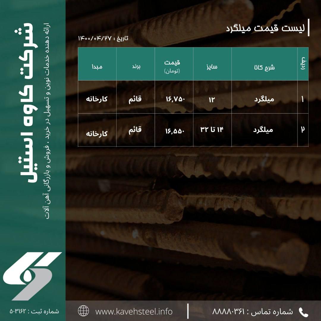 📌لیست قیمت #میلگرد (بردسیر کرمان) - کارخانه 🗓تاریخ : ۱۴۰۰/۰۴/۲۶ شماره های تماس : 📞 02188880361 📞02188780310
