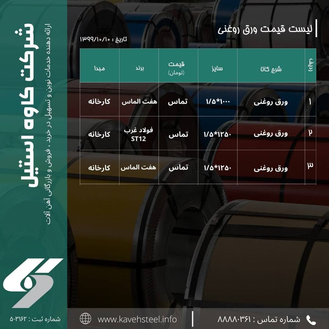 [ Photo ] 📌لیست قیمت #ورق_روغنی 🗓تاریخ : ۱۳۹۹/۱۰/۱۰ شماره های تماس : 📞 02188880361 📞02188782852 @steel_kaveh