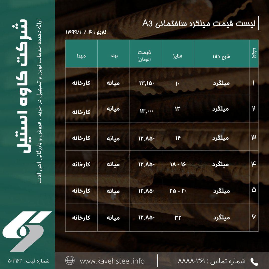 [ Photo ] 📌لیست قیمت #میلگرد(میانه) - کارخانه 🗓تاریخ : ۱۳۹۹/۱۰/۰۳ شماره های تماس : 📞 02188880361 📞02188780310 @steel_kaveh